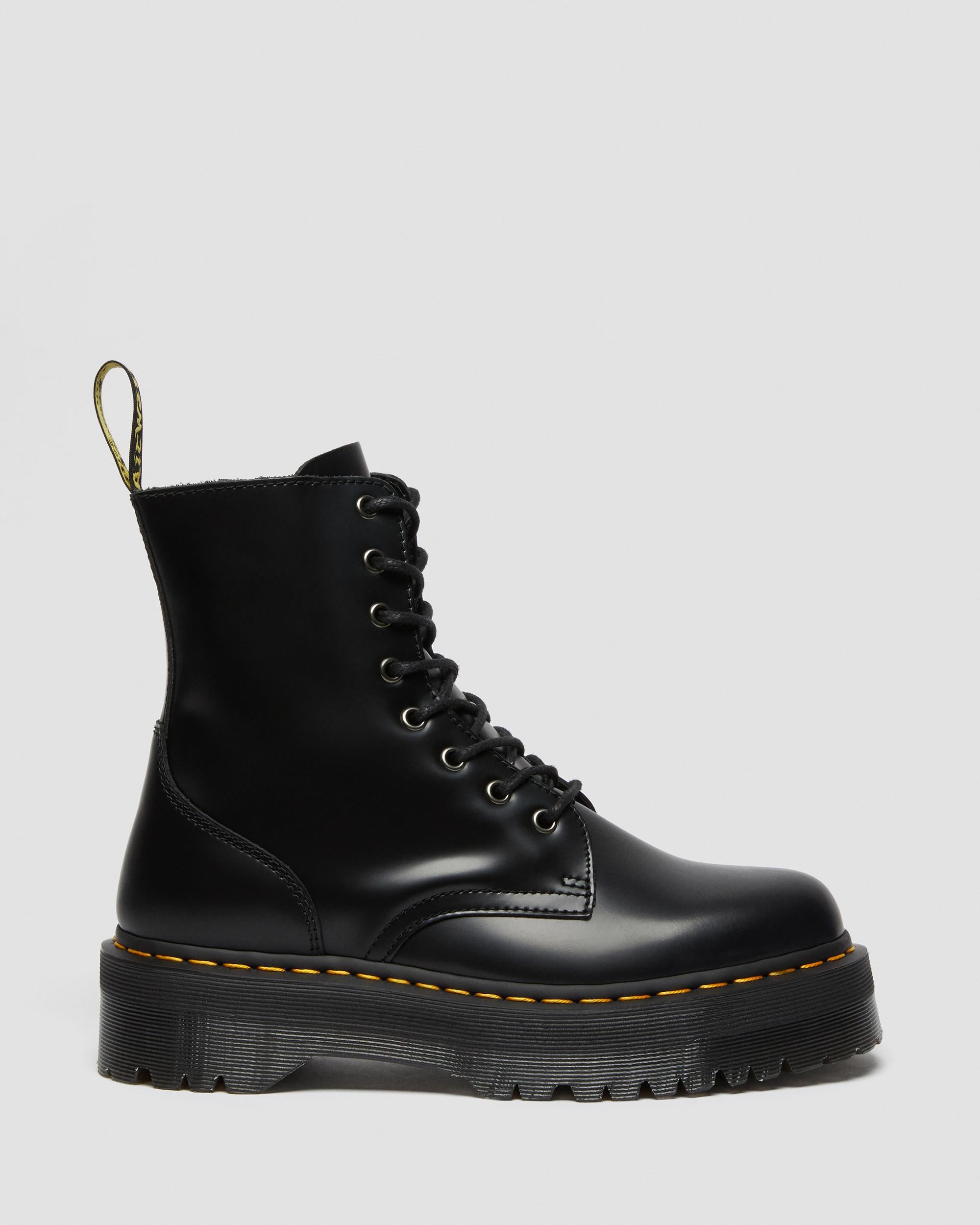 Stand tall. The Jadon boot takes over 6 decades of Dr. Martens DNA and transforms it into a unique, head-turning platform silhouette. Crafted from Polished Smooth leather, you can scuff or polish it however you choose. Our distinctive grooving pattern and yellow welt stitching mark the sole, and the top of the boot is tagged with a black and yellow heel loop. Fitted with a convenient inside zip — for attitude on the move in every outfit. Material A twist on the classic Dr. Martens leather: durable, with a smooth and polished finish. For tips on how to break in your Docs visit our Guide ." Care Instructions Wipe away dirt using a damp cloth. Apply a neutral or correct colored wax based shoe polish. Buff with a Dr. Martens Shoe Brush to restore shine as desired. Learn more about how to care for your Docs with our Shoe Care Guides ." Construction Goodyear Welted - the upper and sole are heat-sealed and sewn together, providing more comfort and durability for years to come. Product code 15265001 Trending Styles