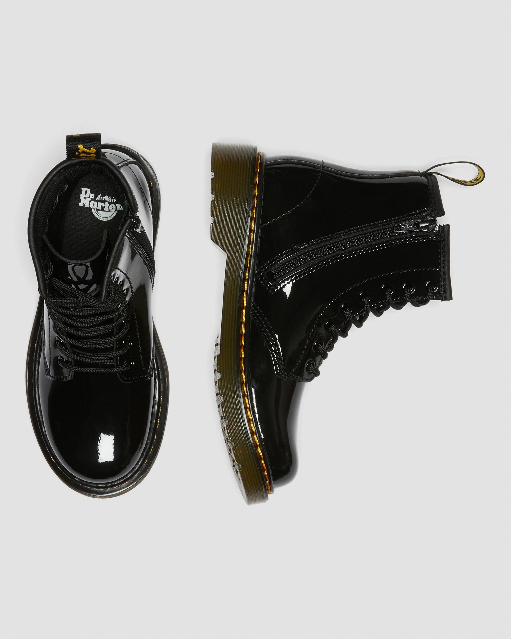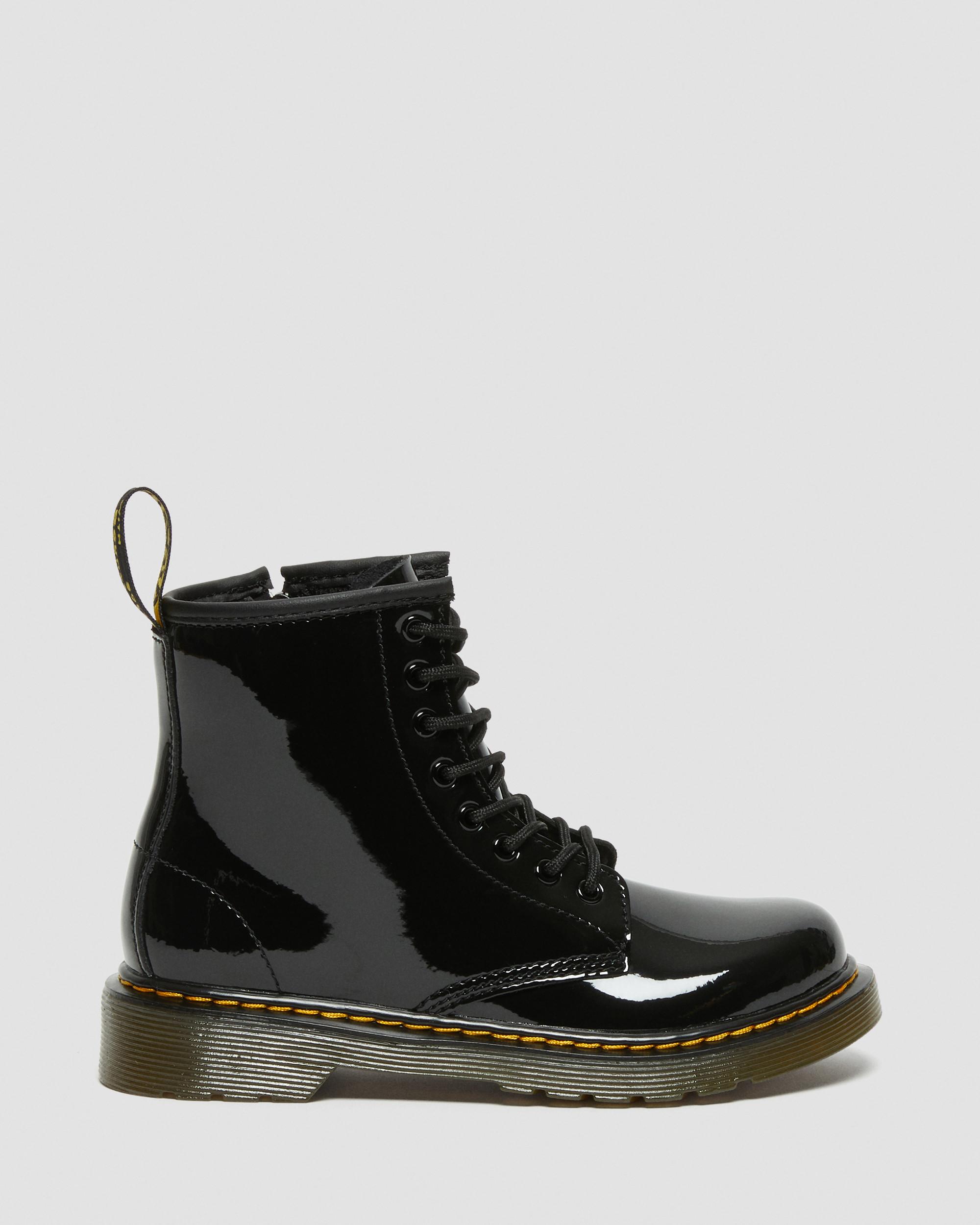 Small soles. Big attitude. Scaling down our Original silhouette, we've crafted mini versions of our 1460 boots for up-and-coming renegades. Built from a soft Patent Lamper leather and sitting on a comfortable, flexible sole, these junior boots are perfect for growing feet that don't keep still. Finished with yellow stitching and a black and yellow heel loop. Inner ankle zip for easy-on, easy-off access Patent Lamper is a fine-grained leather, coated to give a high shine, glossy finish Flexible cemented sole construction for growing feet Material A leather with a classic patent effect. Care Instructions Wipe away dirt with a damp cloth. Spray Dr. Martens Patent Leather Cleaner evenly on to footwear wiping off any excess with a clean cloth. Once dry, buff vigorously to desired shine with a Dr. Martens Shoe Brush. Construction Cemented - the sole is cemented to the upper, durable and flexible for all day comfort. Product code 15382003 Kids' Boots