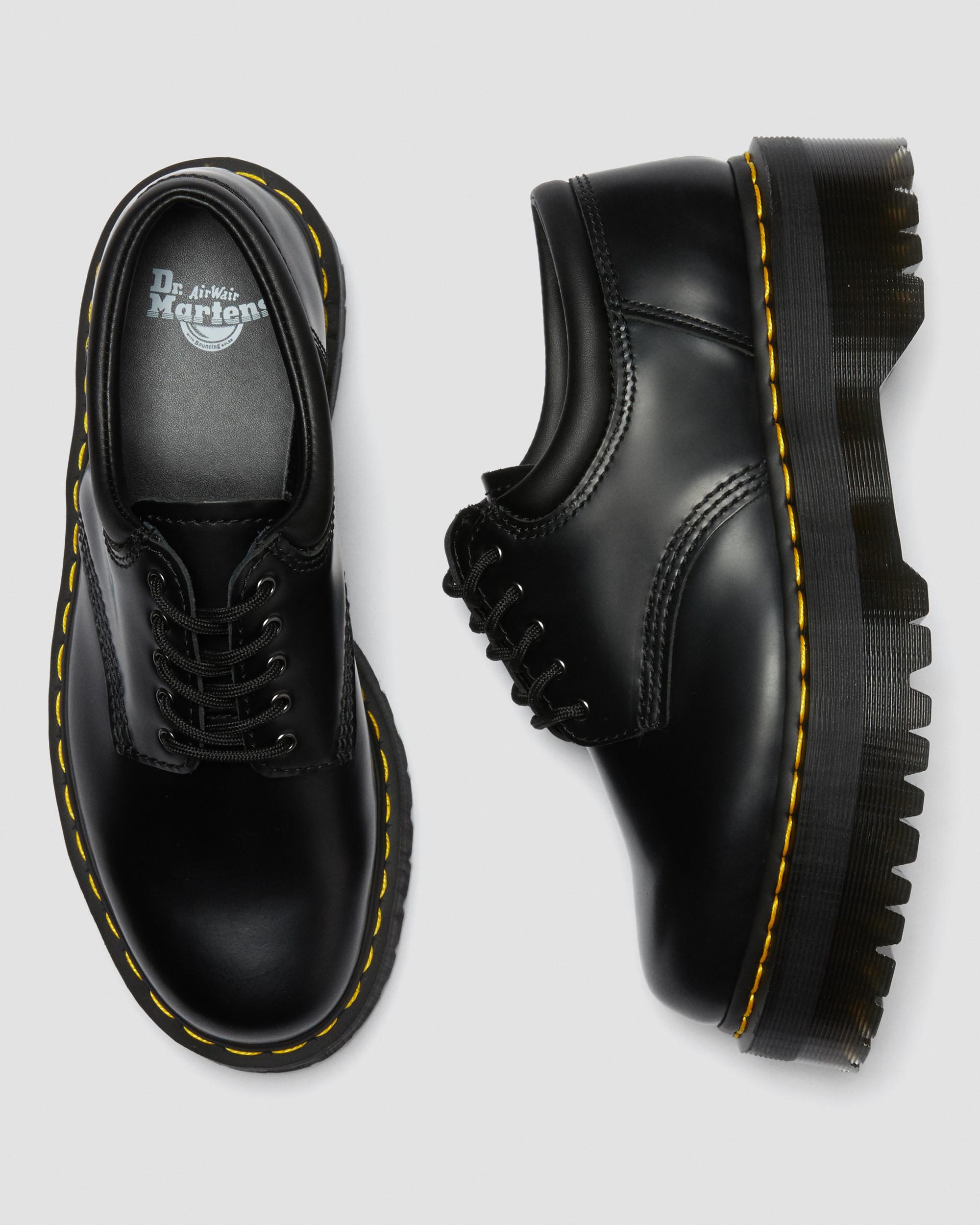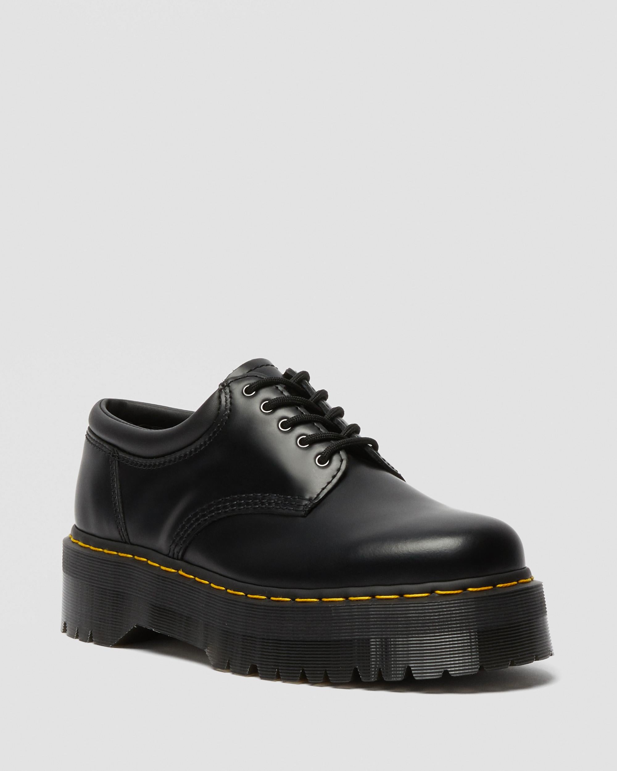 Comfort at new heights. The 8053 shoe is a 5-eye silhouette with a padded collar — a little extra cushioning to make short work of a long day. This platform version of the shoe stands on our chunky Quad sole to elevate every outfit without compromising comfort. Our instantly recognizable yellow welt stitching and grooved edges finish the sole. The shoe is made with Polished Smooth leather, which shapes itself to your feet with every wear and looks great scuffed or buffed to a shine. Sole Height - Platform height: 1 1/2 in; Heel height: 2 in Footbed - Slimmer and a more tapered toe shape Material A twist on the classic Dr. Martens leather: durable, with a smooth and polished finish. For tips on how to break in your Docs visit our Guide ." Care Instructions Wipe away dirt using a damp cloth. Apply a neutral or correct colored wax based shoe polish. Buff with a Dr. Martens Shoe Brush to restore shine as desired. Learn more about how to care for your Docs with our Shoe Care Guides ." Construction Goodyear Welted - the upper and sole are heat-sealed and sewn together, providing more comfort and durability for years to come. Product code 24690001 Gifts For All