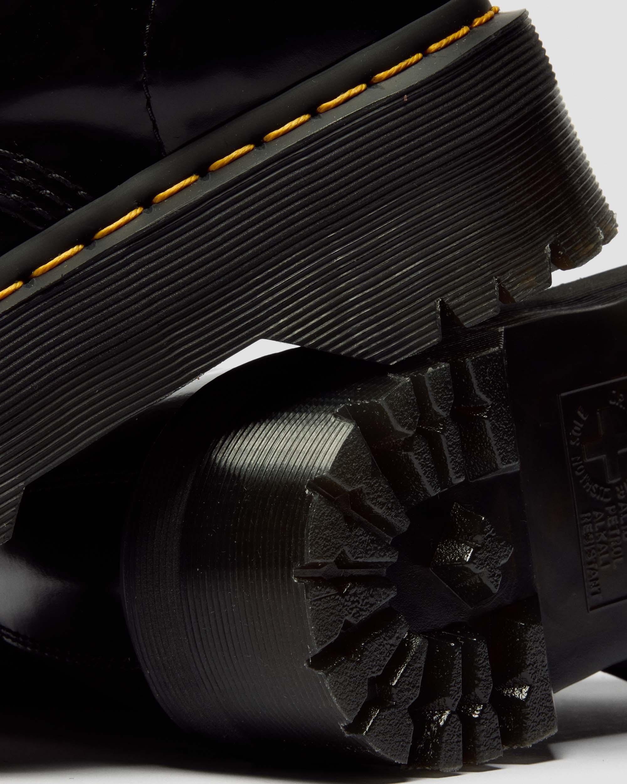 It's your time to shine: We took the towering double-height commando sole of the Quad Retro woman's boot, and powered it up with supple, satin-gloss leather and oversized eyelets with ribbon laces. Comes with two pairs of laces, including a satin ribbon lace Extra-wide eyelets Made with classic Docs DNA, including grooved edges, visible stitching and heel-loop Built on the iconic Dr. Martens air-cushioned sole, which is oil and fat resistant with good abrasion and slip resistance Goodyear-welted product Made with Buttero, a full-grain, smooth leather with a satin gloss and luxurious, supple feel Platform height: 1 1/2 in; Heel height: 1 7/8 in Material A full-grain, smooth leather, with a satin gloss and luxurious supple feel. Care Instructions Wipe away dirt using a damp cloth. Apply a neutral or correct colored wax based shoe polish. Buff with a Dr. Martens Shoe Brush to restore shine as desired. Construction Goodyear Welted - the upper and sole are heat-sealed and sewn together, providing more comfort and durability for years to come. Product code 24861001 Women's Platform Boots