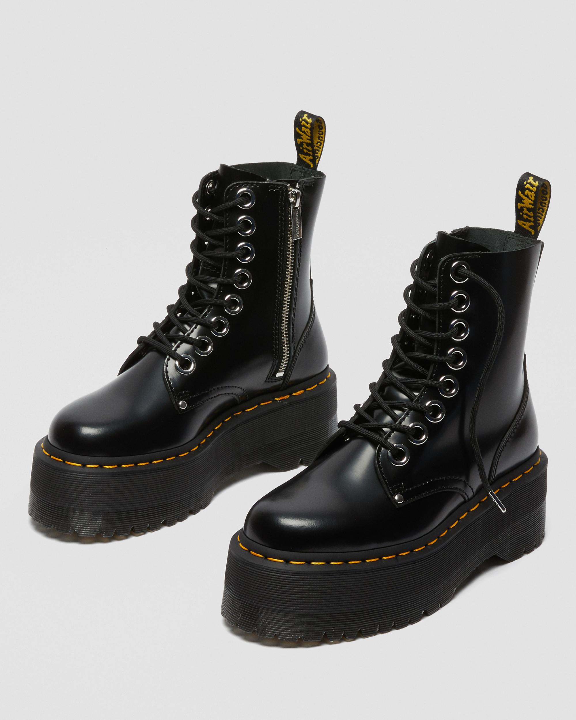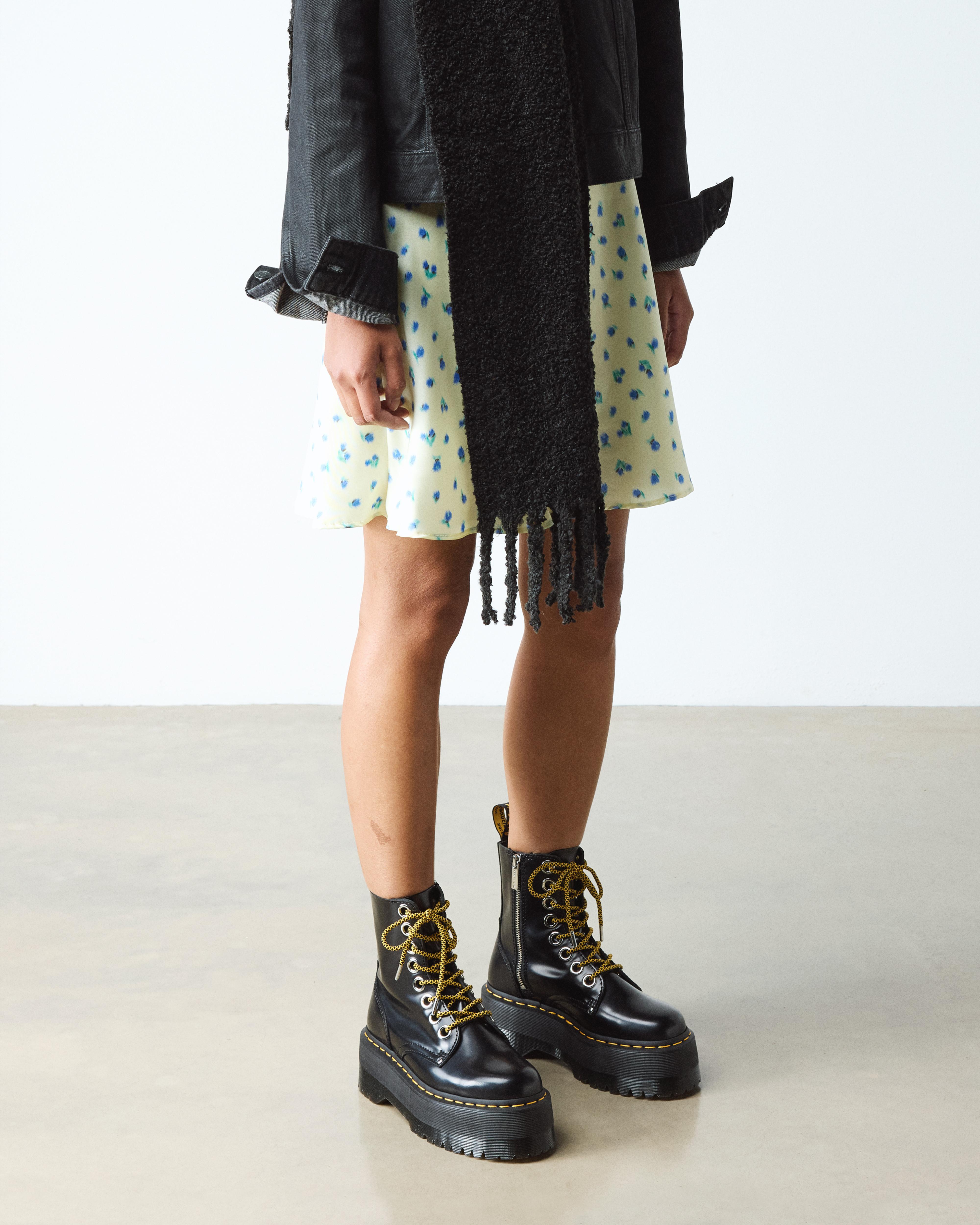 It's landed. Our highest platform to date. The Quad Max sole stands at a towering 2 1/4 inches: built to make wearers feel on top of the world. A full-volume update of our smash-hit Jadon Boot silhouette, these platform boots are kitted out with oversized eyelets and laces with metal aglets. The uncompromising boots also have a medial zip for functionality, standout giraffe laces (and a spare set of black ones) and all our usual DNA. Buttero is a full-grain, smooth leather, with a satin gloss and luxuriously supple feel Our Goodyear-welted lines are heat-sealed at 700°C and reinforced with our signature welt stitch Platform height: 1 7/8 in; Heel height: 2 1/4 in Material A full-grain, smooth leather, with a satin gloss and luxurious supple feel. Care Instructions Wipe away dirt using a damp cloth. Apply a neutral or correct colored wax based shoe polish. Buff with a Dr. Martens Shoe Brush to restore shine as desired. Construction Goodyear Welted - the upper and sole are heat-sealed and sewn together, providing more comfort and durability for years to come. Product code 25566001 Gifts For All