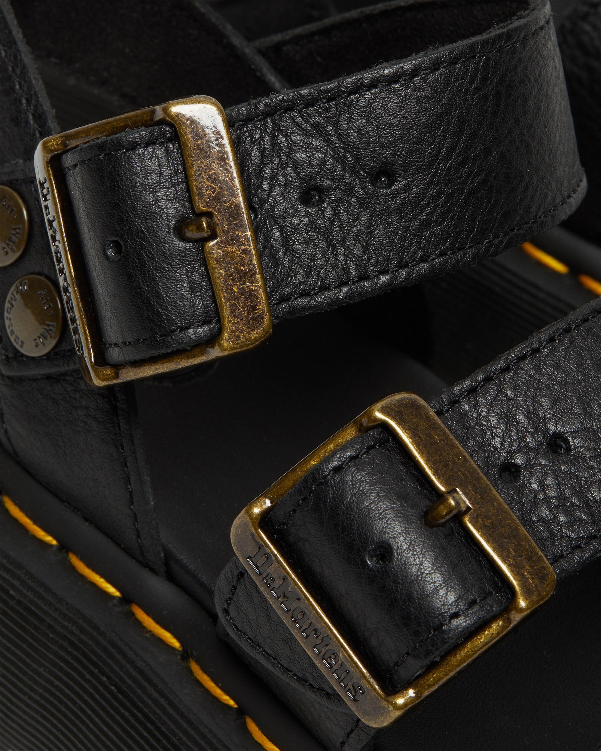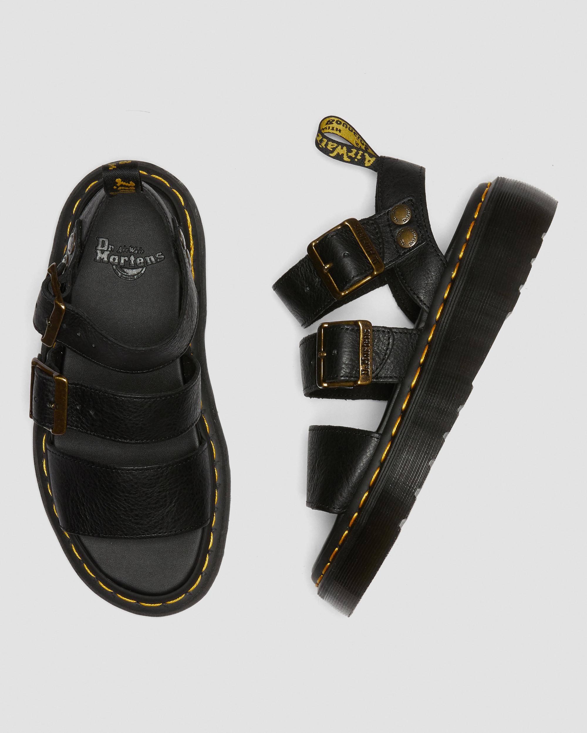 We've reinvented our headlining Gryphon sandal for the new season. Now standing on a high-rise Quad sole, the Gryphon Quad is manufactured from soft Pisa leather with rugged brass hardware. Welted, well-engineered and packed with Docs DNA — the sandals are finished with yellow welt stitching and an AirWair heel loop. Pisa is a medium-weight milled Nappa leather with a soft tumbled handle and richly pigmented waxy finish Construction - Made with our Goodyear-welted lines are heat-sealed at 700˚C and reinforced with our signature welt stitch Platform height: 1 5/8 in Heel height: 2 in Footbed - Slimmer and a more tapered toe shape Material Pisa - a medium-weight milled nappa leather with a super-soft tumbled handle and richly pigmented waxy finish. Care Instructions Wipe away dirt using a damp cloth. Apply a neutral or correct colored wax based shoe polish. Buff with a Dr. Martens Shoe Brush to restore shine as desired. Construction Goodyear Welted - the upper and sole are heat-sealed and sewn together, providing more comfort and durability for years to come. Product code 25720001 Women's Sandals