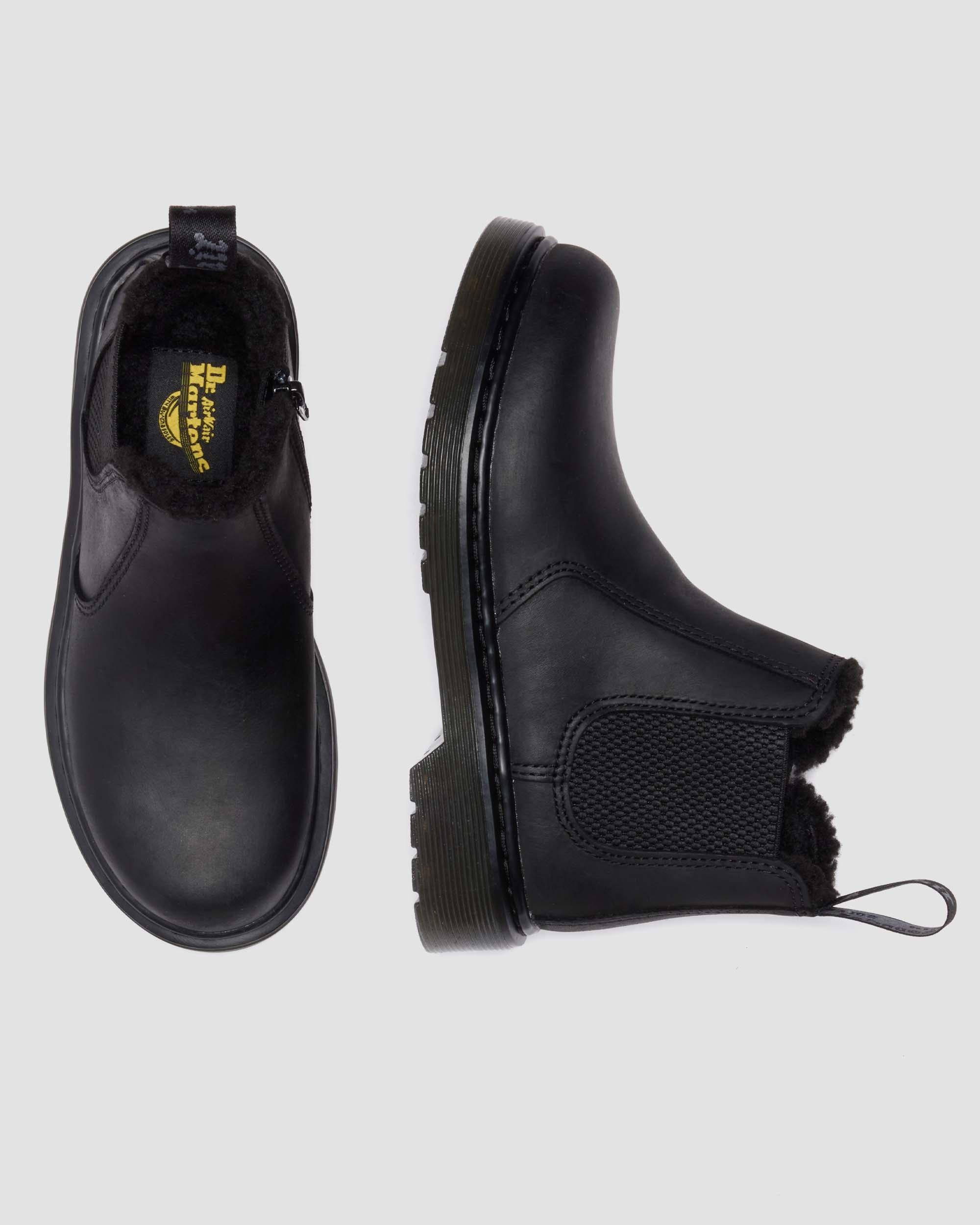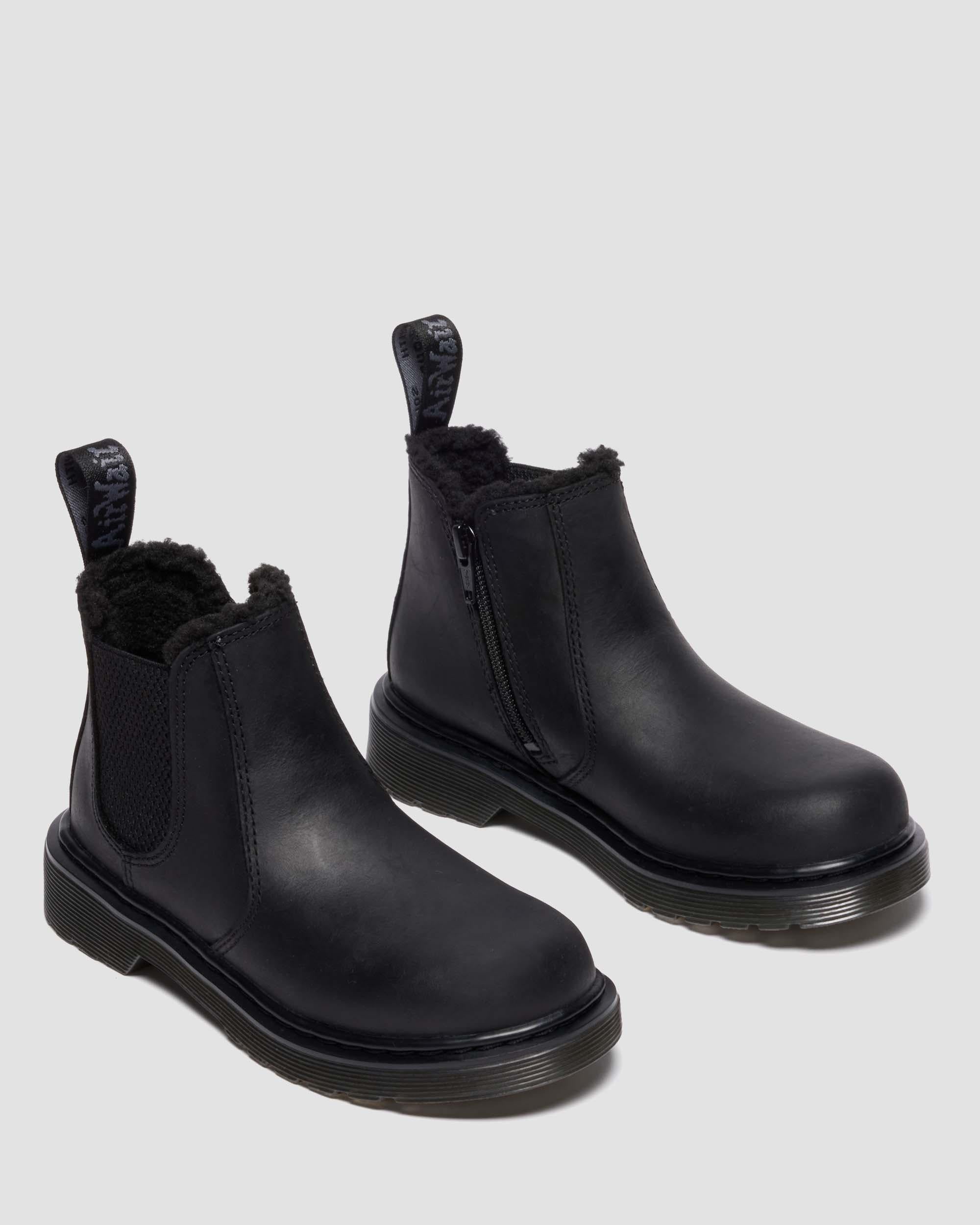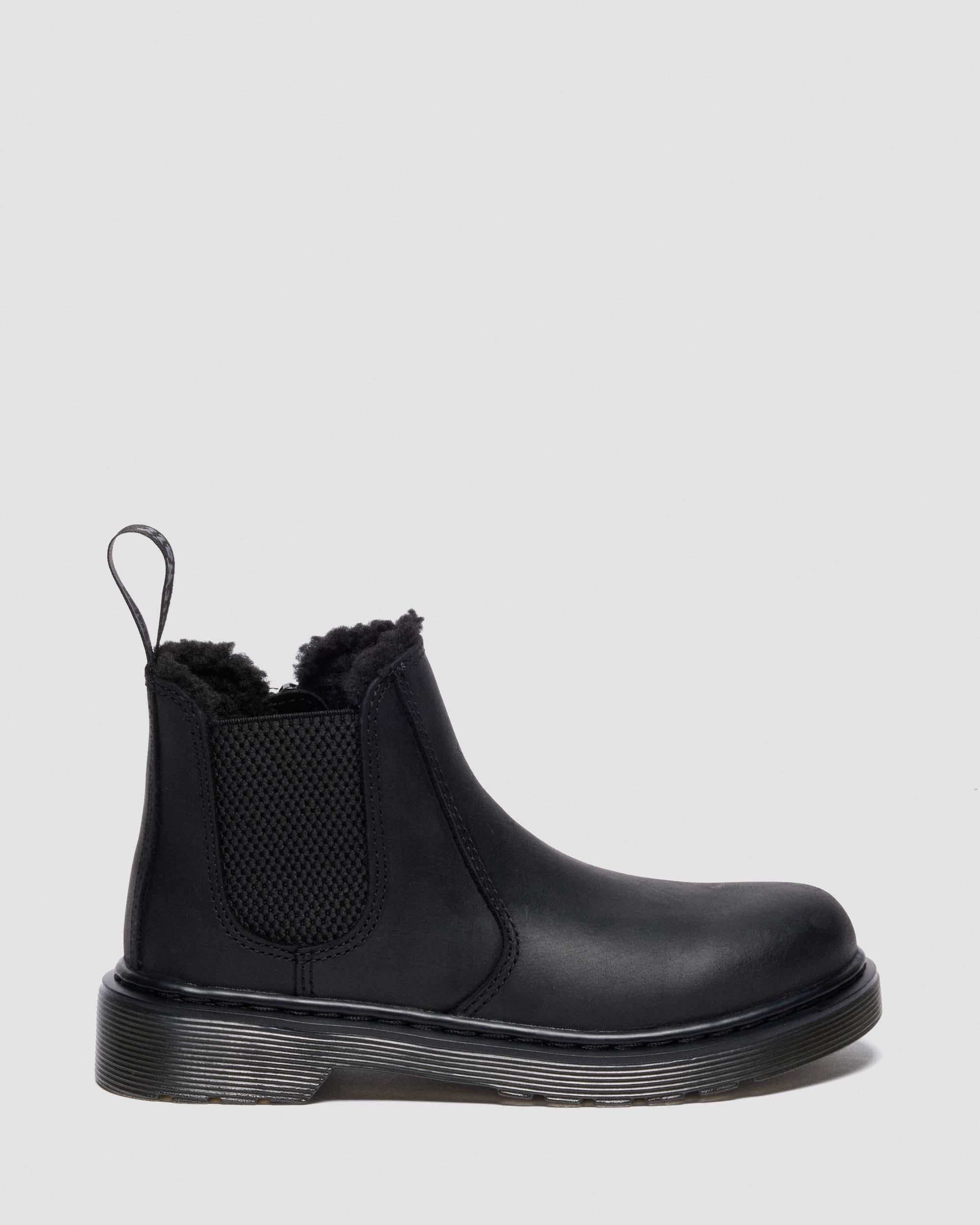 WarmWair, in upcoming rebel sizes. Made to keep little feet dry and comfortable, these boots are built from a waxy, water-repellent leather and lined with Sherpa faux fur. With black welt stitching, a smoke colored sole and a black charcoal heel loop, the monochrome boots are ready for whatever your little rebel throws at them. Warm, hardwearing and winter-proof: WarmWair is soft, insulated lining crafted from carefully selected materials The 2976 is the rugged Docs take on the classic Chelsea boot. Manufactured since the 70s Republic WP is a textured leather with waxy, oily finish and medium pull-up effect. Care with Dr. Martens Wonder Balsam Flexible cemented sole construction for growing feet Care Instructions Wipe away dirt using a damp cloth. We do not recommend the use of leather cleaners, as it could damage the finish. Construction Cemented - the sole is cemented to the upper, a durable and flexible construction for all day comfort. Product code 26042001 Junior Boots, Shoes & Sandals