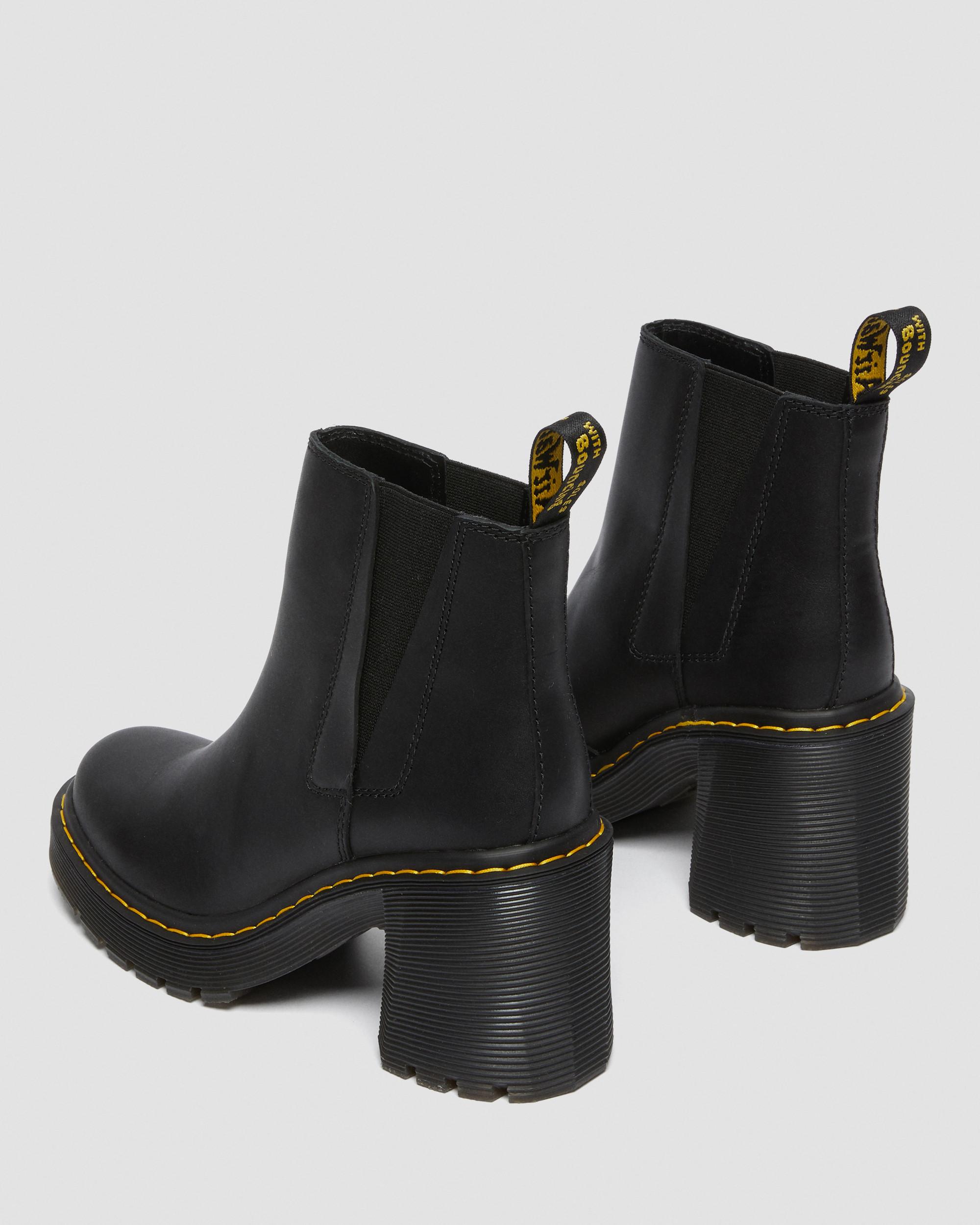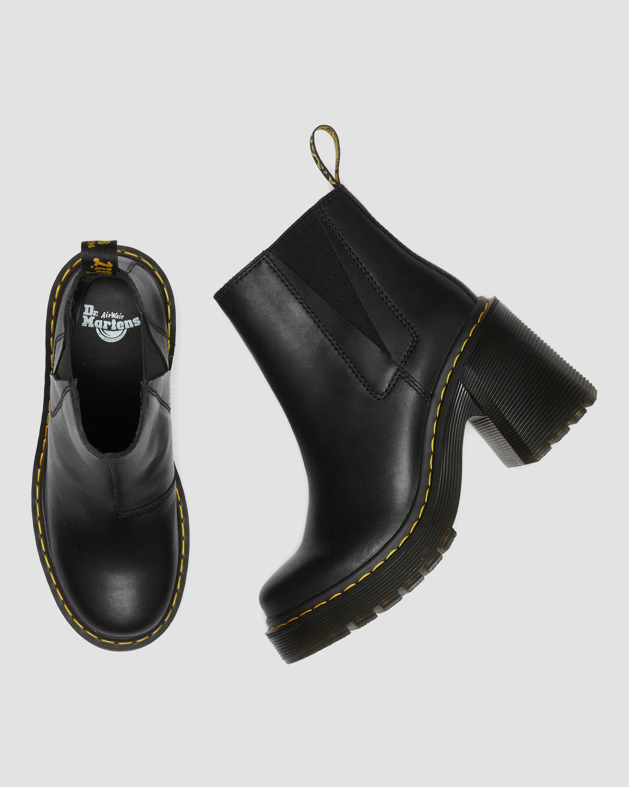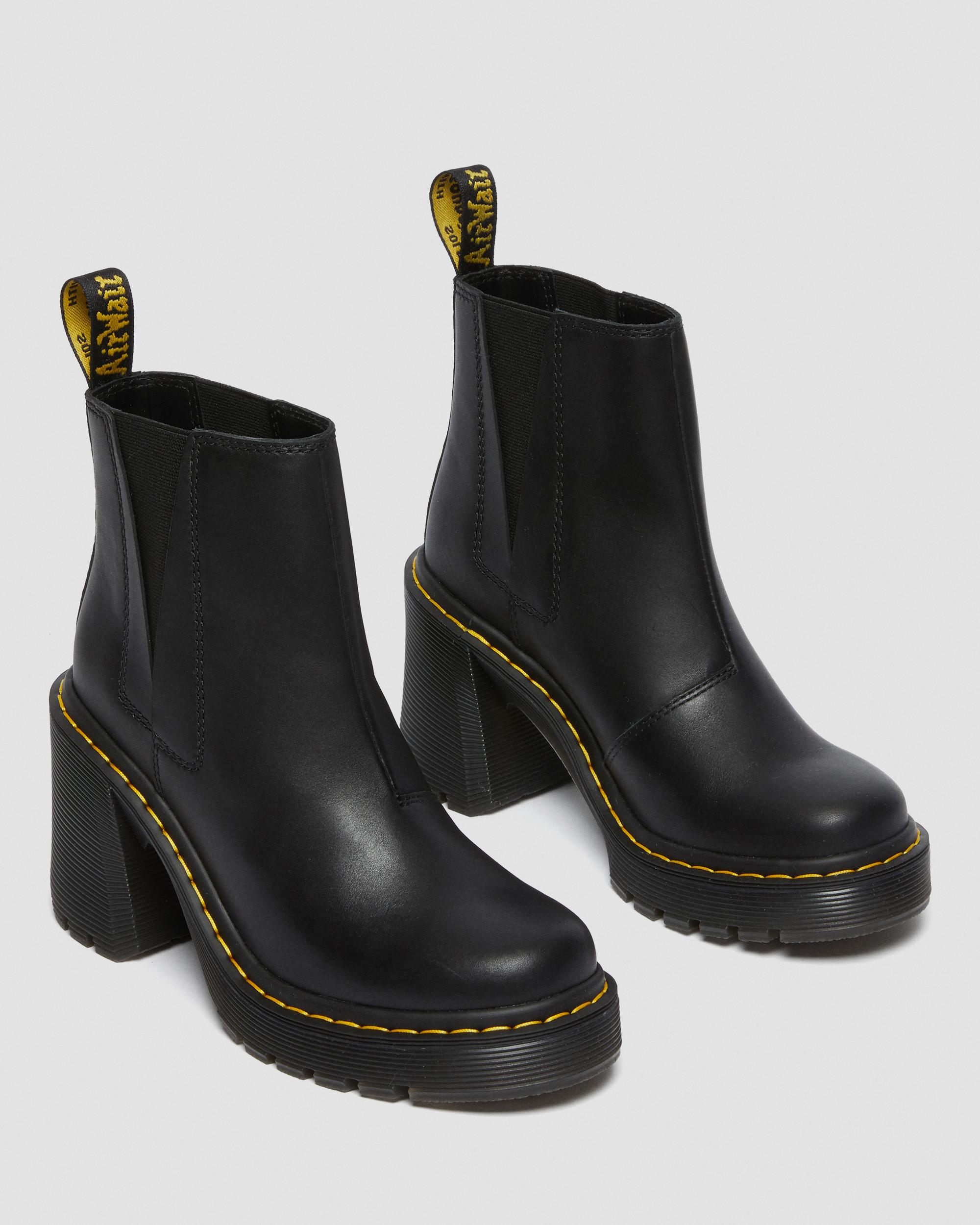There are Chelsea boots. And then there's the Spence. Our new season boot is stacked high with a grooved outsole and towering flared heel — built to make you feel on top of the world. Made from a soft yet rugged new leather, Sendal, and marked with all our signature DNA, these hard-hitting boots are even tougher than they look. Sendal is a semi-aniline, natural-looking nappa leather with a smooth full-grain finish. Clean with a damp cloth and care with Dr. Martens Shoe Polish Made with durable cemented construction Platform height: 1 1/8 in; Heel height: 3 3/4 in Material Sendal is a high quality, naturally soft leather that’s smooth and hardwearing. Care Instructions Wipe away dirt using a damp cloth. Apply a neutral or correct colored wax based shoe polish. Buff with a Dr. Martens Shoe Brush to restore shine as desired. Construction Cemented - the sole is cemented to the upper, a durable and flexible construction for all day comfort. Product code 26440001 Chelsea Boots
