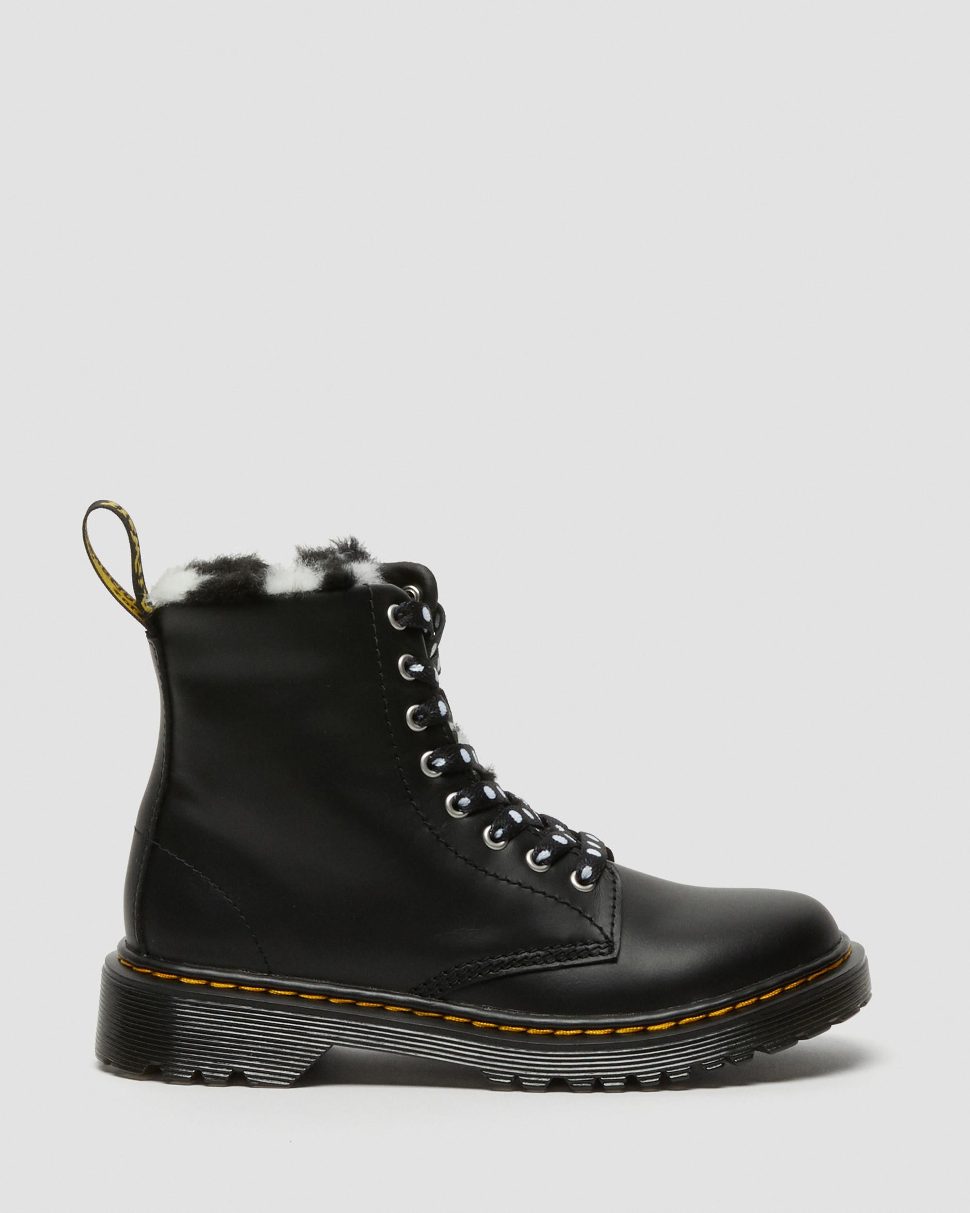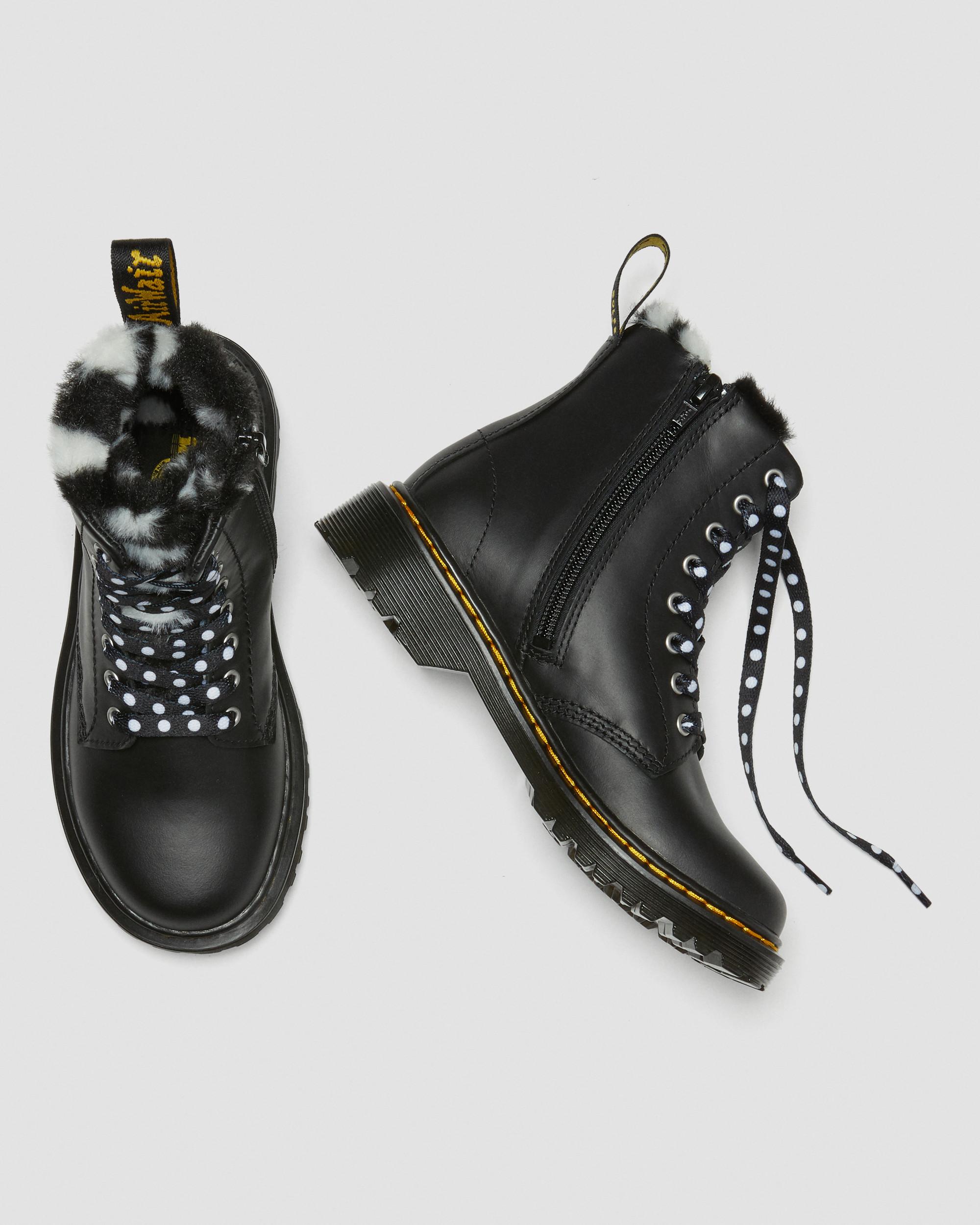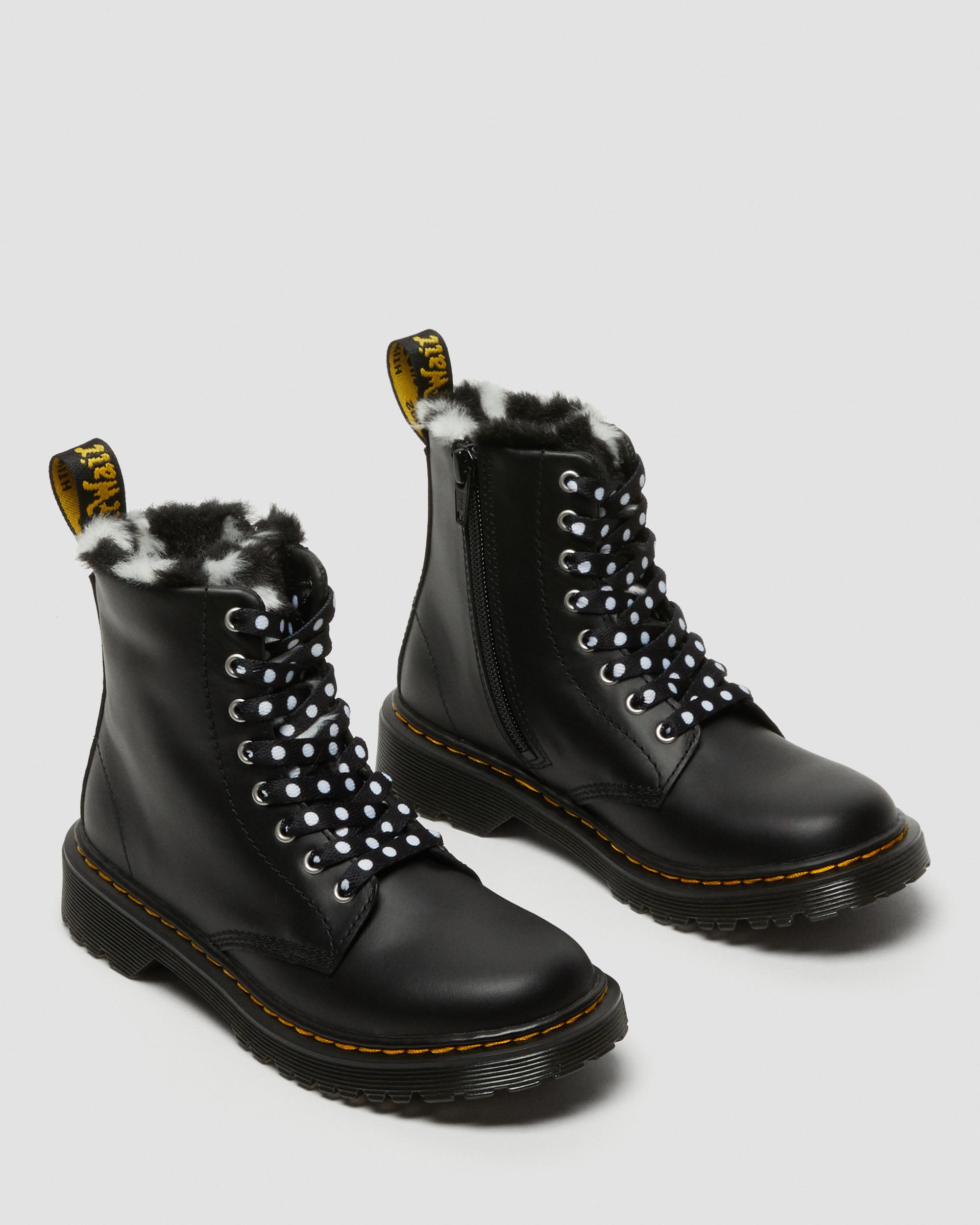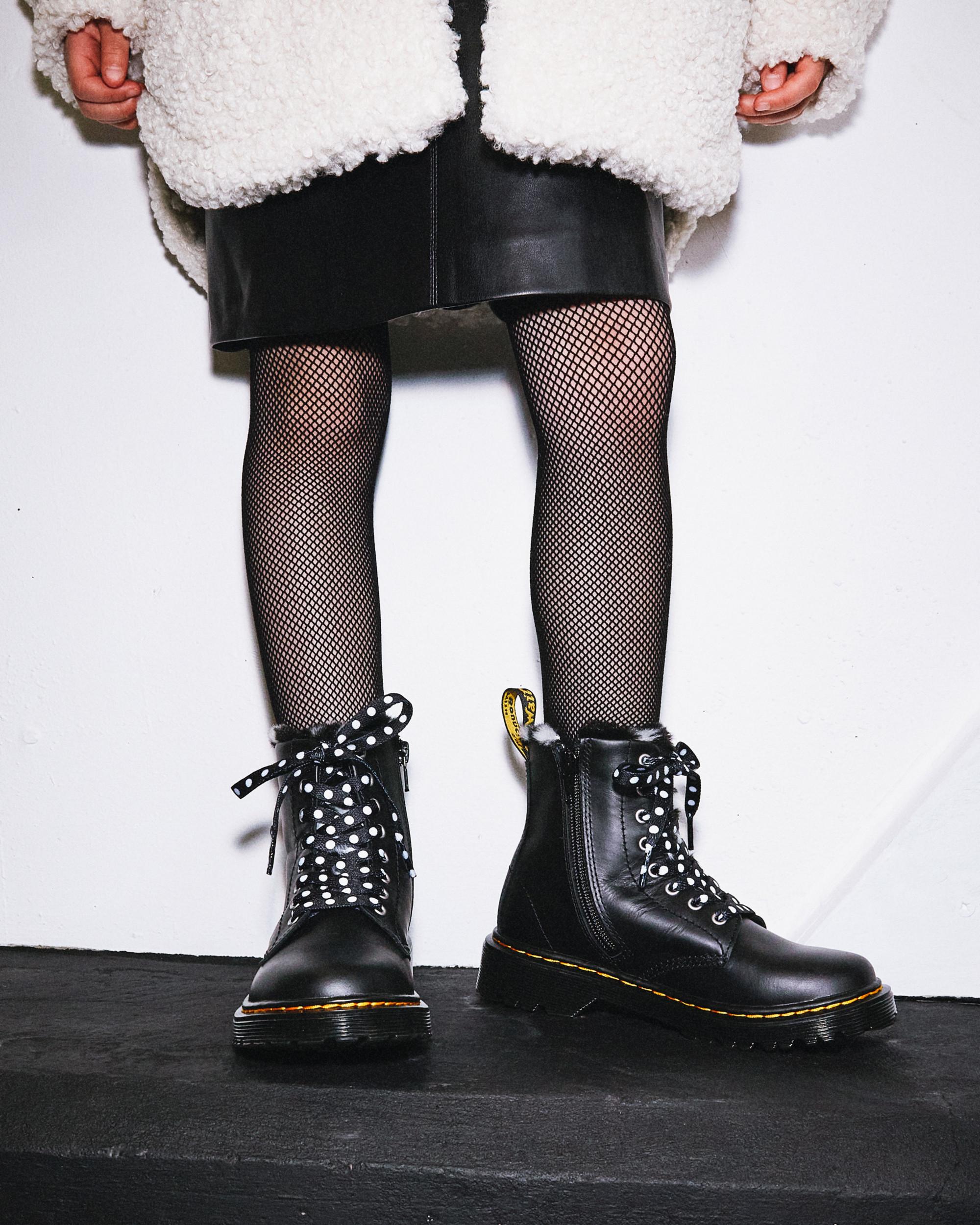 Winter ready and loaded with Docs attitude. Our scaled-down 1460 Serena boot is built to stand out, with polka dot detailing and an added faux-fur lining. Featuring inside zips for easy on/off access and a tough but comfortable Smoke BEN sole, the boots are finished with all our core markings including a black and yellow heel loop and yellow stitching. Born on 01.04.60. Named the 1460. Over six decades, our 8-eye work boot has become iconic Inner ankle zip for easy-on, easy-off access Faux fur-lined for added warmth Romario is a super soft, lightweight, waxy leather Flexible cemented sole construction for growing feet Material Romario is a super-soft, lightweight waxy leather used on our kids styles. Care Instructions Wipe away dirt using a damp cloth. Apply a neutral or correct colored wax based shoe polish. Buff with a Dr. Martens Shoe Brush to restore shine as desired. Construction Cemented - the sole is cemented to the upper, a durable and flexible construction for all day comfort. Product code 26995001 Junior Boots, Shoes & Sandals