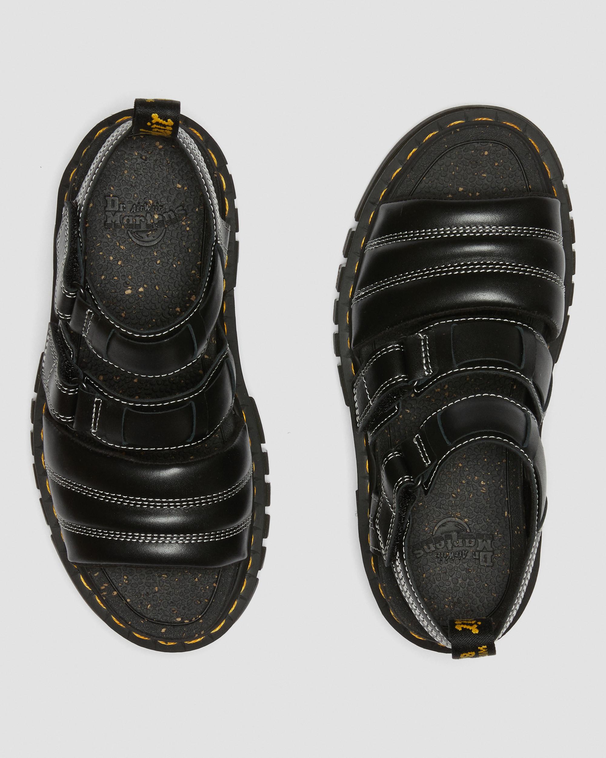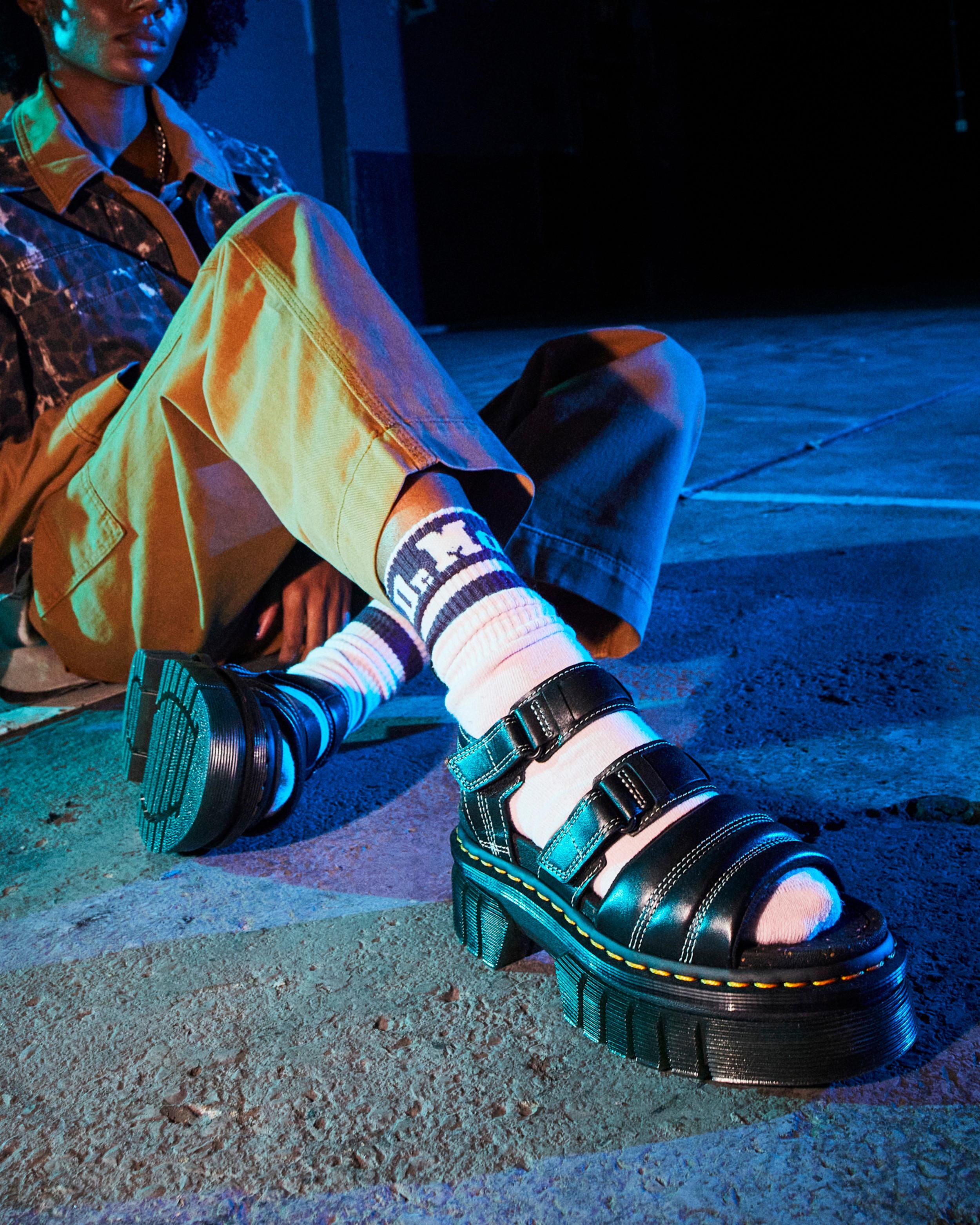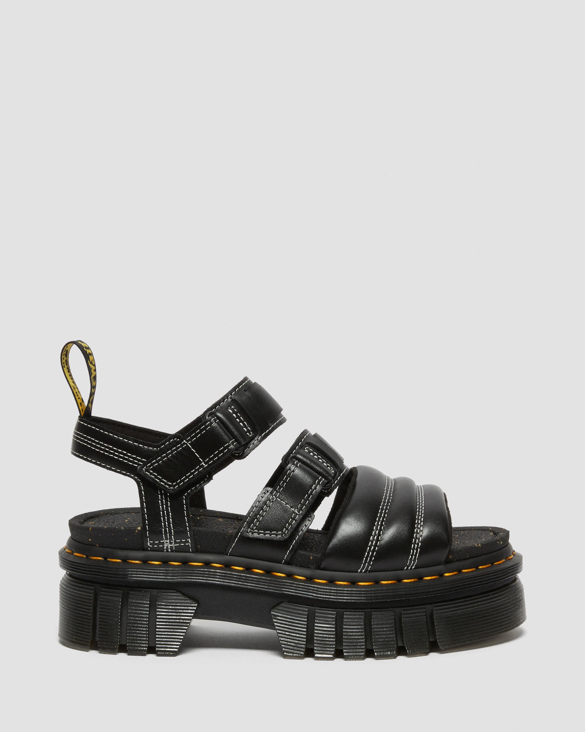 The sandal revolution continues. The 3-strap Ricki sandal is built on our innovative Quad Neoteric sole — with a lightweight EVA midsole and PVC outsole. Constructed using soft Nappa Lux leather, the Ricki has been enhanced with a padded front strap and back heel for comfort from the first step. Detailed with contrast white triple-row stitching and muted hardware. Fitted with an antimicrobial footbed and finished with our signature yellow welt stitching and heel loop. Nappa Lux is a classic nappa leather — soft and smooth to the touch This evolved platform packs the height of our renowned Quad sole into a lightweight construction. At 1 7/8 inch, the Quad Neoteric sole has a lightweight EVA midsole and a PVC outsole with deep, rugged cleats. Featuring an amped up version of our trademark DMS tread pattern Construction - Made with our Goodyear-welted lines that are heat-sealed at 700˚C and reinforced with our signature welt stitch Sole Height - Platform height: 1 1/2 in; Heel height: 1 7/8 in Standard last - Recommended for all feet, but perfect for average to wide width feet Material Nappa Lux - a classic nappa leather — soft and smooth to the touch. Care Instructions Wipe away dirt using a damp cloth. Apply a neutral or correct colored wax based shoe polish. Buff with a Dr. Martens Shoe Brush to restore shine as desired. Construction Goodyear Welted - the upper and sole are heat-sealed and sewn together, providing more comfort and durability for years to come. Product code 27763001 Women's Sandals