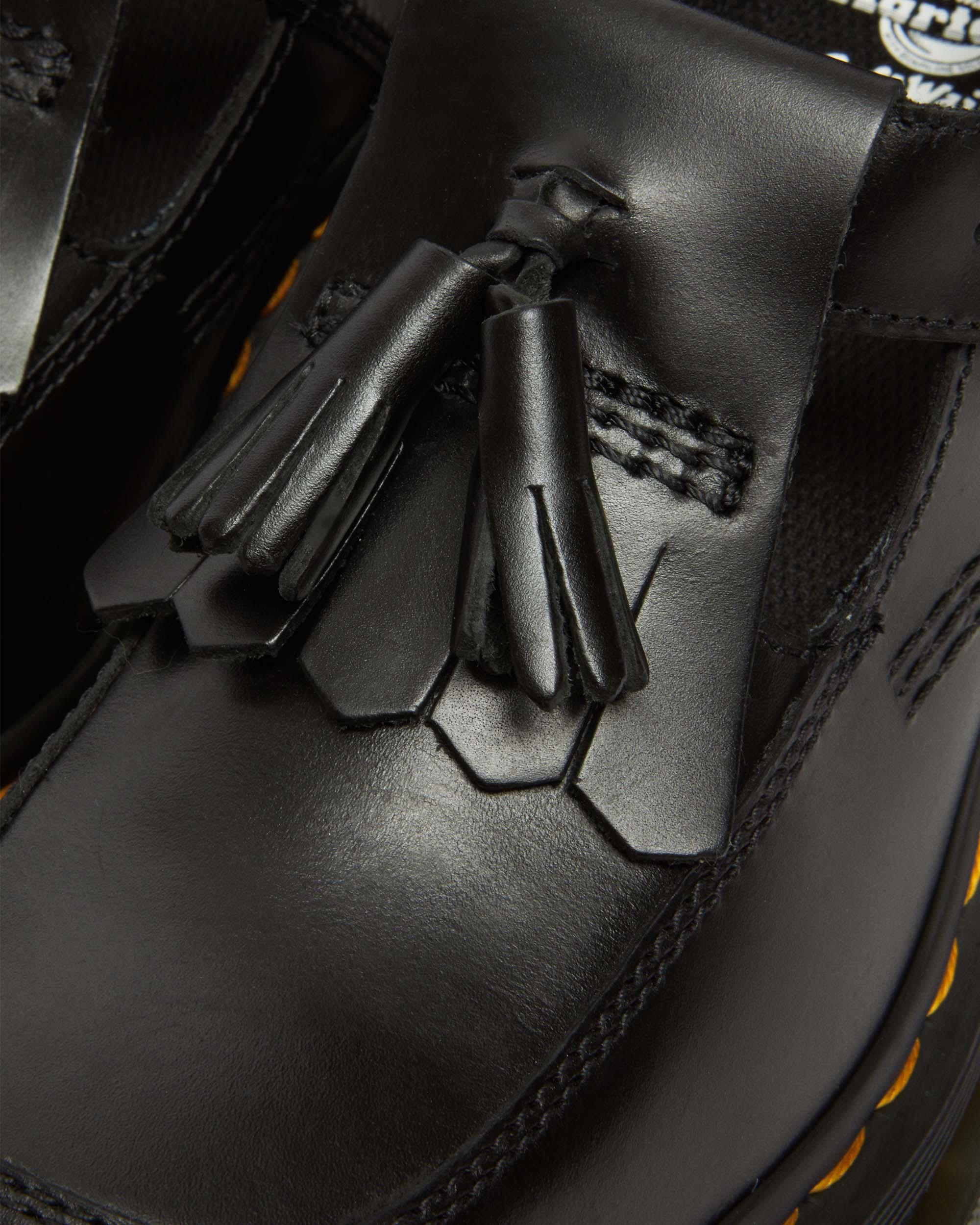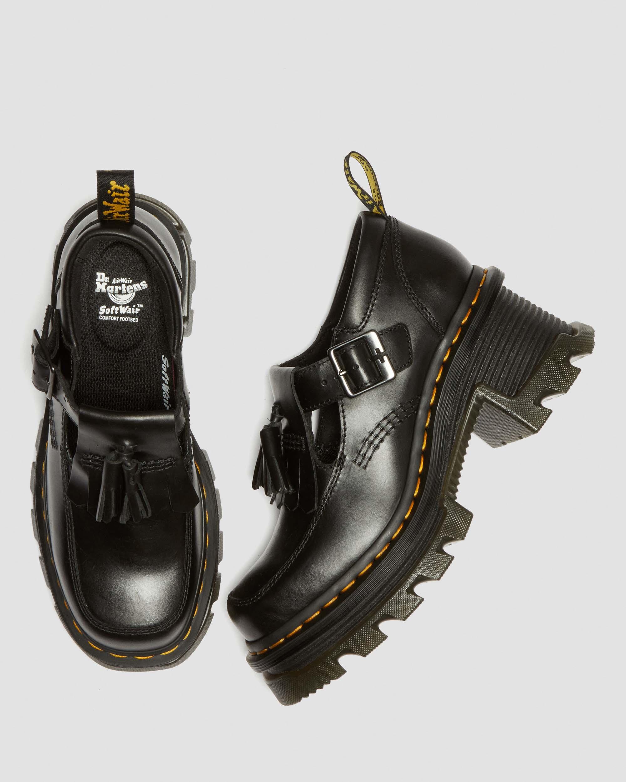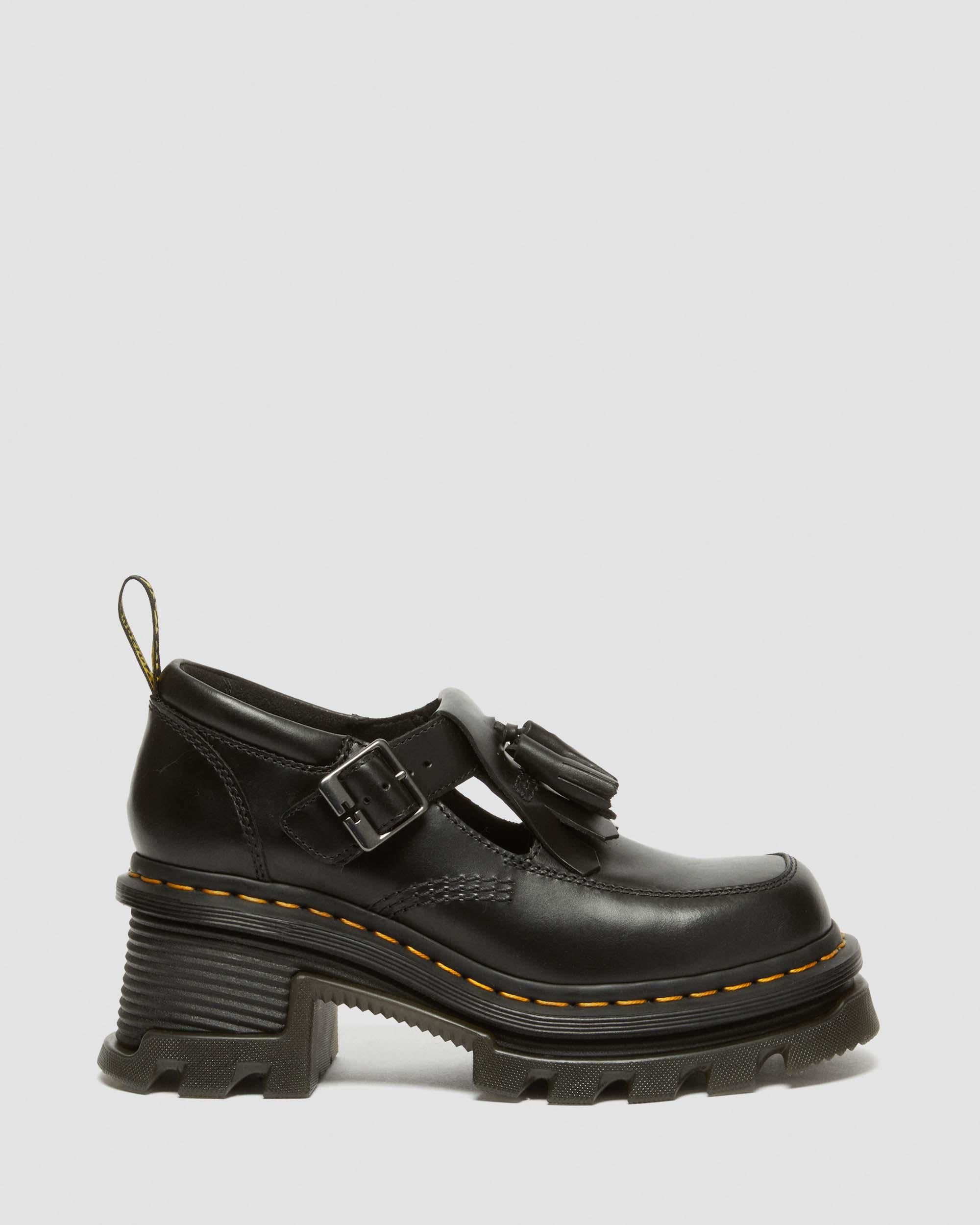 Heels — our way. Our new chunky heel is unmistakably DM’s, with exaggerated lugging and a grooving pattern to mirror our signature DMS outsole. This statement Mary Jane silhouette is built from Atlas leather with a leather kiltie, tassels, and a distinctive square toe shape. The shoe is also detailed with tonal stitching, a gunmetal buckle, and a black and yellow DM’s heel loop. Our signature yellow welt stitching stands out as an unmistakable final touch. Atlas is a classic waxed aniline leather with a subtle pull-up and a slight sheen Construction - Made with a Goodyear-welted lines that are heat-sealed and reinforced with our signature welt stitch new platform heights Footbed - Slimmer and a more tapered toe shape Material Classic smooth, waxed leather colored with soluble dyes. With a subtle ombre and satin sheen finish. Care Instructions Wipe away dirt using a damp cloth. Apply Dr. Martens Wonder Balsam to the outside of your footwear to keep the leather supple, strong and smooth. Once dry, buff vigorously to desired shine using a clean Dr. Martens Shoe Brush . Repeat regularly to prolong the life of your footwear. Construction Goodyear Welted - the upper and sole are heat-sealed and sewn together, providing more comfort and durability for years to come. Product code 31494001 Mary Jane Shoes