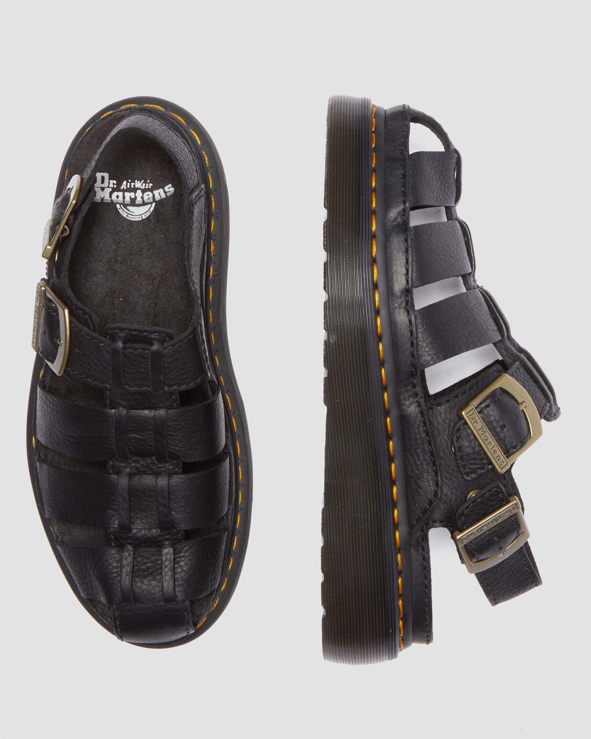 Dial up summer. Our new Fisherman sandal revives summer-infused nostalgia with the attitude, timelessness and versatility of our 90s fisherman. This new edition is stacked on a stacked Quad Shore sole to stand out as much as we always have. Detailed with an antique gold branded buckle and DM’s rivets, they have yellow welt stitching to reinforce your DM’s DNA. Grizzly is a heavyweight leather with a subtle grained finish that ages and develops with time Unmistakably DM's. The Shore sole keeps our sandals grounded and instantly recognizable. Marked with our signature grooving and secured with contrast yellow welt stitching Sole Height - Platform height: 1 in: Heel height: 1 1/2 in Footbed - Wider and a more rounded toe shape Material Grizzly is a heavyweight leather, with a subtle grained finish. Care Instructions Wipe away dirt using a damp cloth. Apply Dr. Martens Wonder Balsam to the outside of your footwear to keep the leather supple Construction Goodyear Welted - the upper and sole are heat-sealed and sewn together, providing more comfort and durability for years to come. Product code 31524001 Sandals