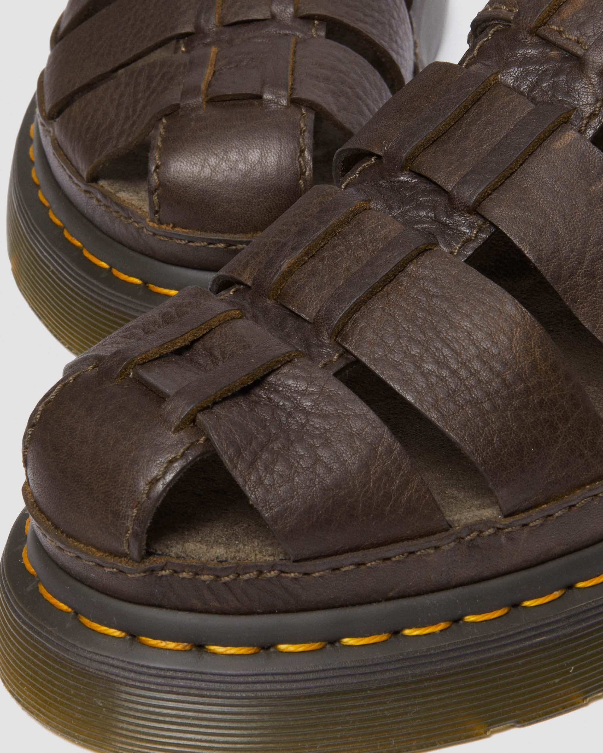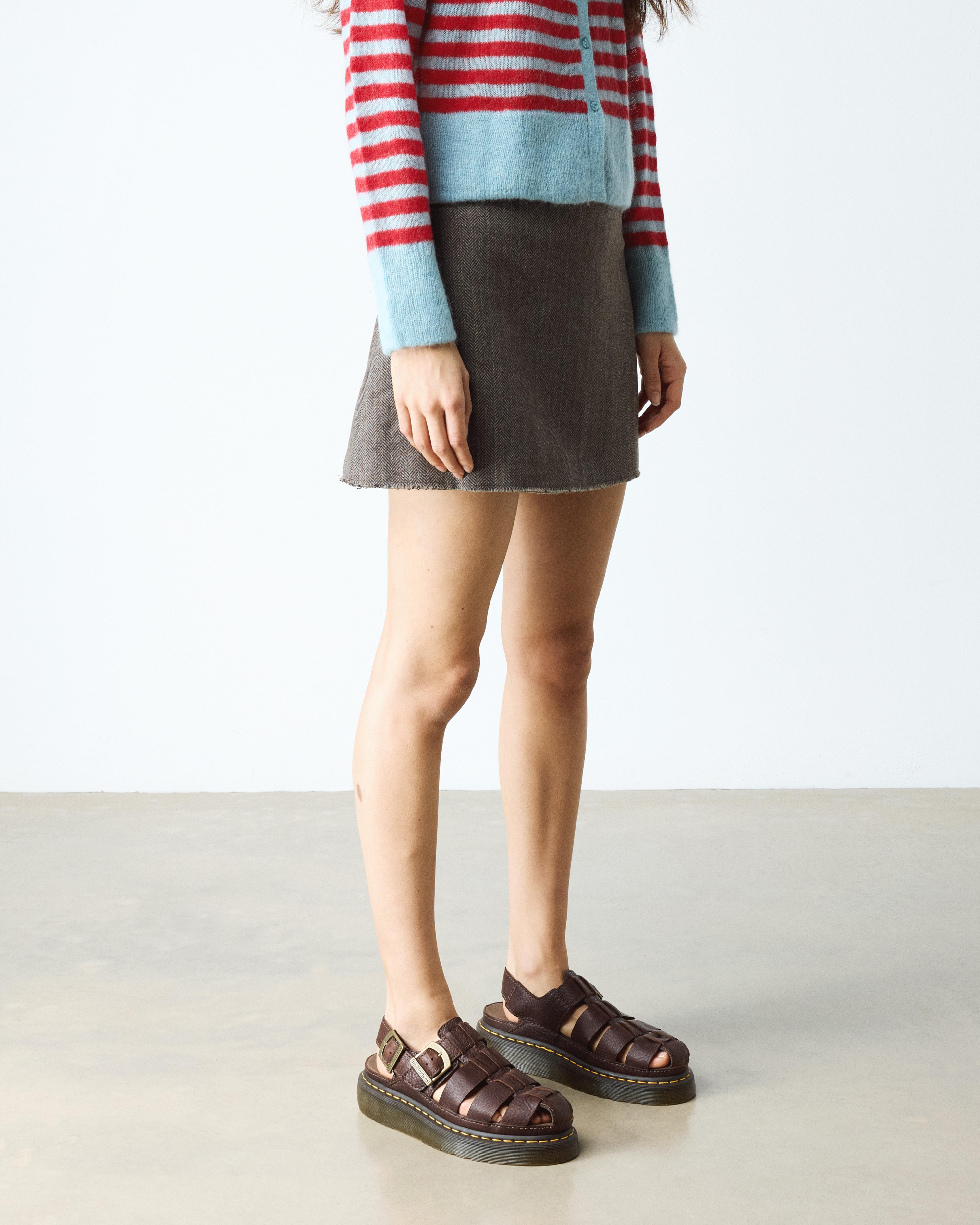Dial up summer. Our new Fisherman sandal revives summer-infused nostalgia with the attitude, timelessness and versatility of our 90s fisherman. This new edition is stacked on a stacked Quad Shore sole to stand out as much as we always have. Detailed with an antique gold branded buckle and DM’s rivets, they have yellow welt stitching to reinforce your DM’s DNA. Grizzly is a heavyweight leather with a subtle grained finish that ages and develops with time Unmistakably DM's. The Shore sole keeps our sandals grounded and instantly recognizable. Marked with our signature grooving and secured with contrast yellow welt stitching Sole Height - Platform height: 1 in: Heel height: 1 1/2 in Footbed - Wider and a more rounded toe shape Material Grizzly is a heavyweight leather, with a subtle grained finish. Care Instructions Wipe away dirt using a damp cloth. Apply Dr. Martens Wonder Balsam to the outside of your footwear to keep the leather supple Construction Goodyear Welted - the upper and sole are heat-sealed and sewn together, providing more comfort and durability for years to come. Product code 31524201 Sandals