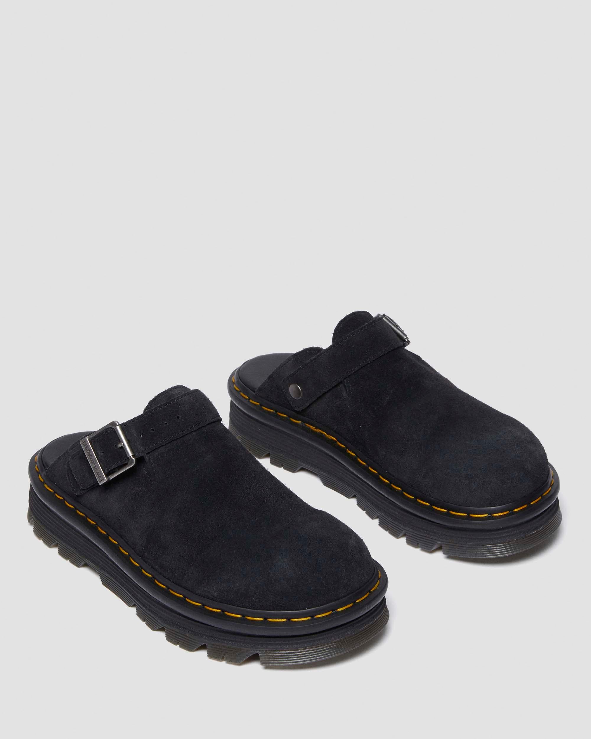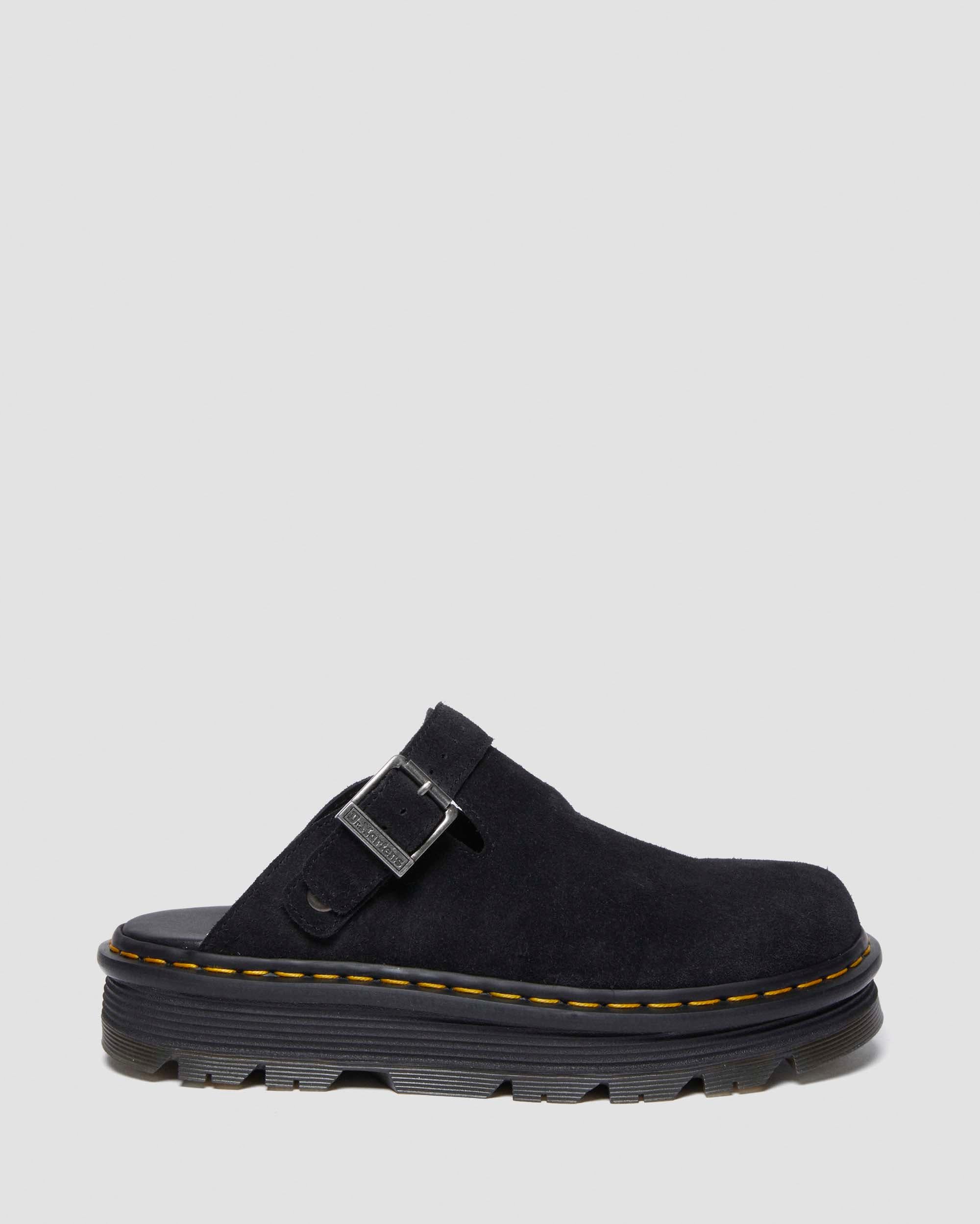 The Zebzag mule is our latest innovation in comfort: built on a hybrid air-cushioned sole that fuses feather-weight EVA with rugged PVC. Crafted from lightweight, versatile suede, they’re designed to be worn however you feel like – in summer or out of the conventional season. The adjustable strap ensures a secure fit, while the welted construction delivers our signature durability. Yellow welt stitching marks the mules as Dr. Martens. Construction - Made with a Goodyear-welted lines that are heat-sealed and reinforced with our signature welt stitch Sole Height - Platform height: 1 in; Heel height: 1 1/4 in Footbed - Wider and a more rounded toe shape Material E.H. Suede - a classic leather with a silky to touch texture. Care Instructions Clean by brushing with a suede or stiff bristle brush. Construction Goodyear Welted - the upper and sole are heat-sealed and sewn together, providing more comfort and durability for years to come. Product code 31657001 Gifts For All