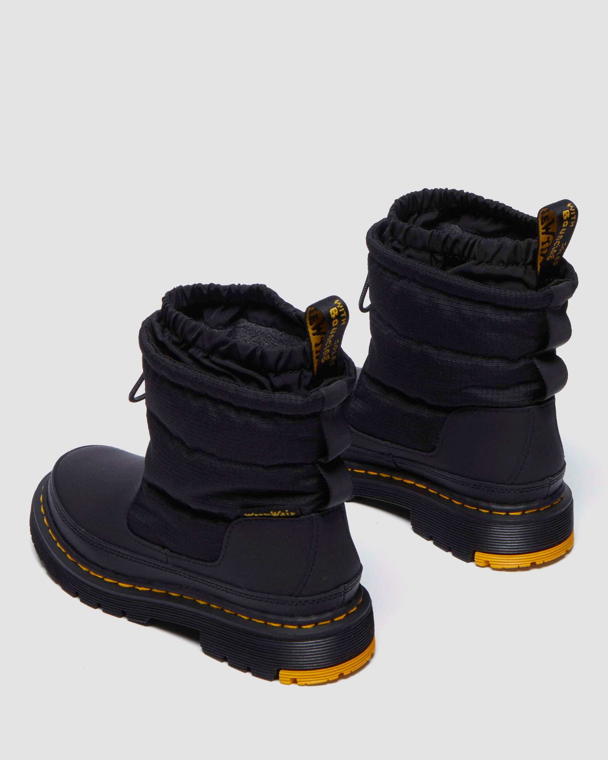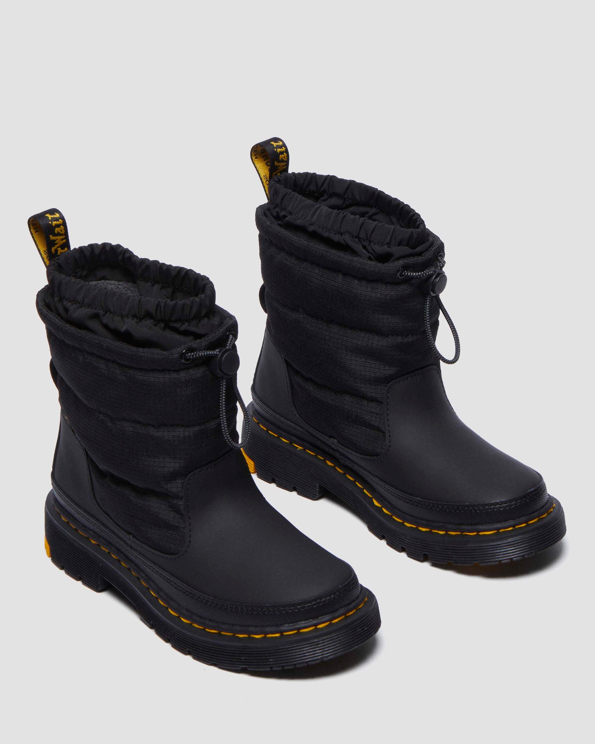 Winter won’t know what hit it. With WarmWair protection and extra traction grip, our latest kid-friendly silhouette is built for mini rebels to take on the cold. Our boldest silhouette yet, constructed from ripstop to form our exaggerated quilted puffer ankle and contrasted with the sleek Rubberised Leather and a Element Split leather trim that forms the heel, vamp and toe of the boot. Secured to active feet with an elasticated ankle lace, then secured to the pavement with our kid-friendly DM’s WinterGrip sole. Element is a PU coated leather with a fine geometric emboss pattern. Clean with a damp cloth only. Warm, hardwearing and winter-proof: WarmWair is soft, insulated lining crafted from carefully selected materials. Flexible cemented sole construction for growing feet. Construction Cemented - the sole is cemented to the upper, a durable and flexible construction for all day comfort. Product code 32036001 Junior Boots, Shoes & Sandals