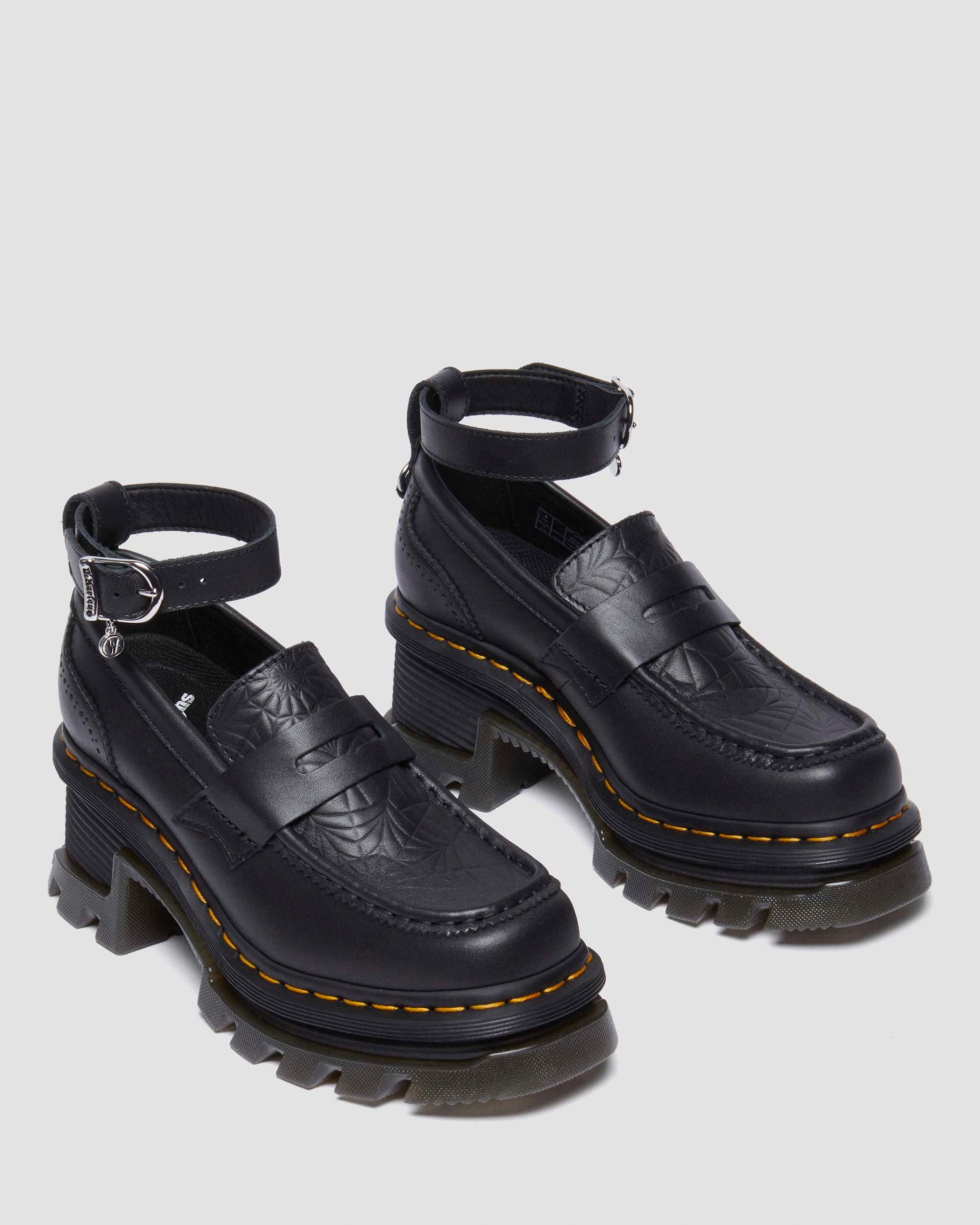 Outcasts are in. This limited-edition loafer silhouette from our DM’s x Wednesday collection is made with supple Wanama leather with stained-glass-inspired embroidery across the vamp. The top of the shoe has an adjustable ankle strap with a dual-branded buckle, and the back of the heel is tagged with a hardware ring. The shoe is fitted with a SoftWair insole for comfortable wear. The heeled sole has exaggerated grooving and is secured with classic yellow welt stitching. Wanama is a lightweight leather with a satin-sheen finish. Clean with a damp cloth and care with Dr. Martens Shoe Polish or Wonder Balsam. Our SoftWair memory foam footbed ensures comfort from the first step. Our Goodyear-welted lines are heat-sealed and reinforced with our signature welt stitch. Material A lightweight, natural-looking leather with a satin-sheen finish. Care Instructions Wipe away dirt using a damp cloth. Apply a neutral or correct colored wax based shoe polish. Buff with a Dr. Martens Shoe Brush to restore shine as desired. " Construction Goodyear Welted - the upper and sole are heat-sealed and sewn together, providing more comfort and durability for years to come. Product code 32222001 Halloween Boots & Shoes