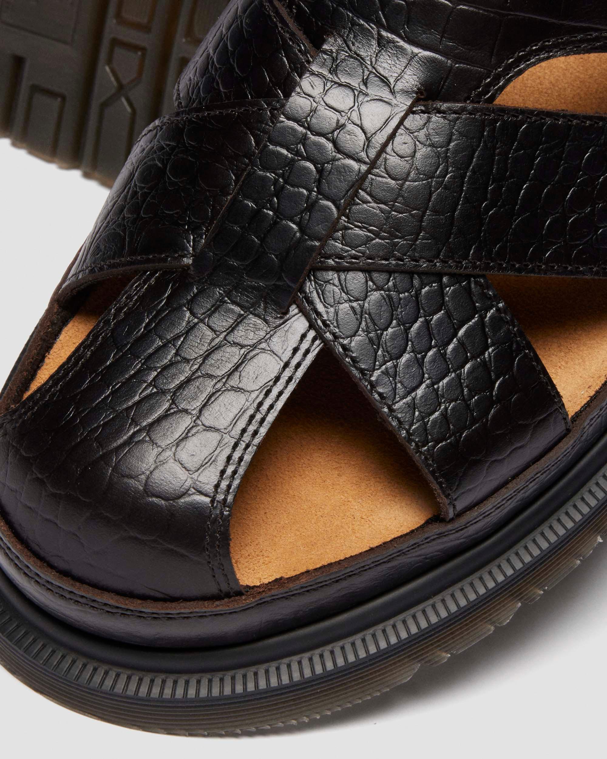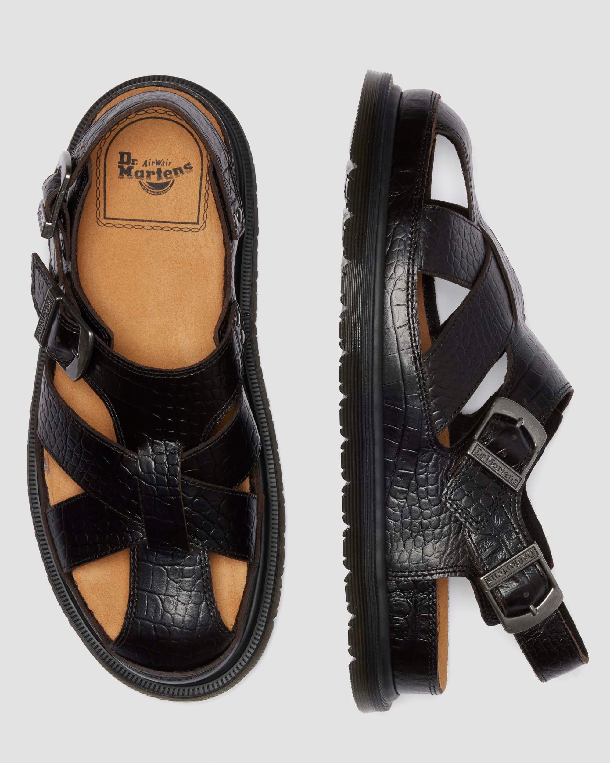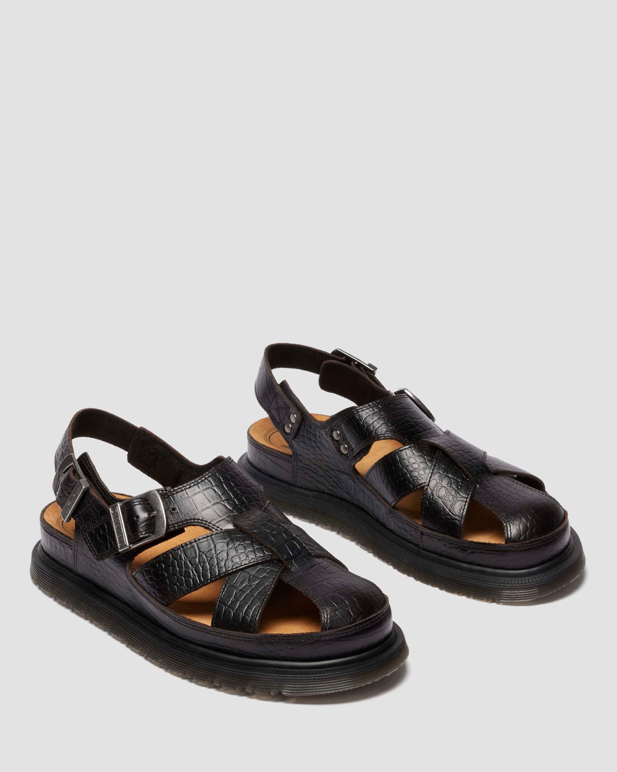 Wild in the streets. Introducing the new Archive Fisherman sandal. Built from soft and strong Analine leather with an embossed crocodile skin texture. Set on the reintroduced low-profile San outsole and secured with a subtle plain black welt. Fitted with twin adjustable buckles in brushed silver. Material Croc Embossed Analine leather with strong wax coat and subtle pull up effect Care Instructions Clean away dirt using a damp cloth and allow to dry, then apply Dr.Martens Wonder Balsam, add to shoes using the sponge applicator supplied with the product. Construction Goodyear Welted - the upper and sole are heat-sealed and sewn together, providing more comfort and durability for years to come. Product code 41181200 Men's Sale