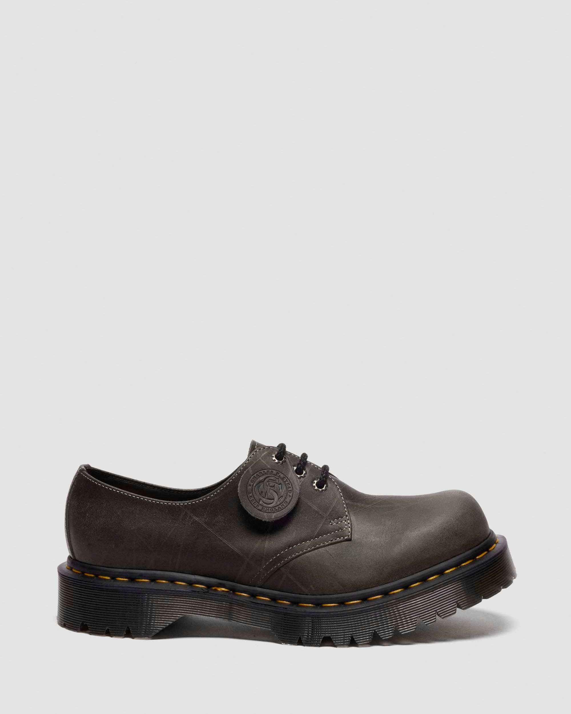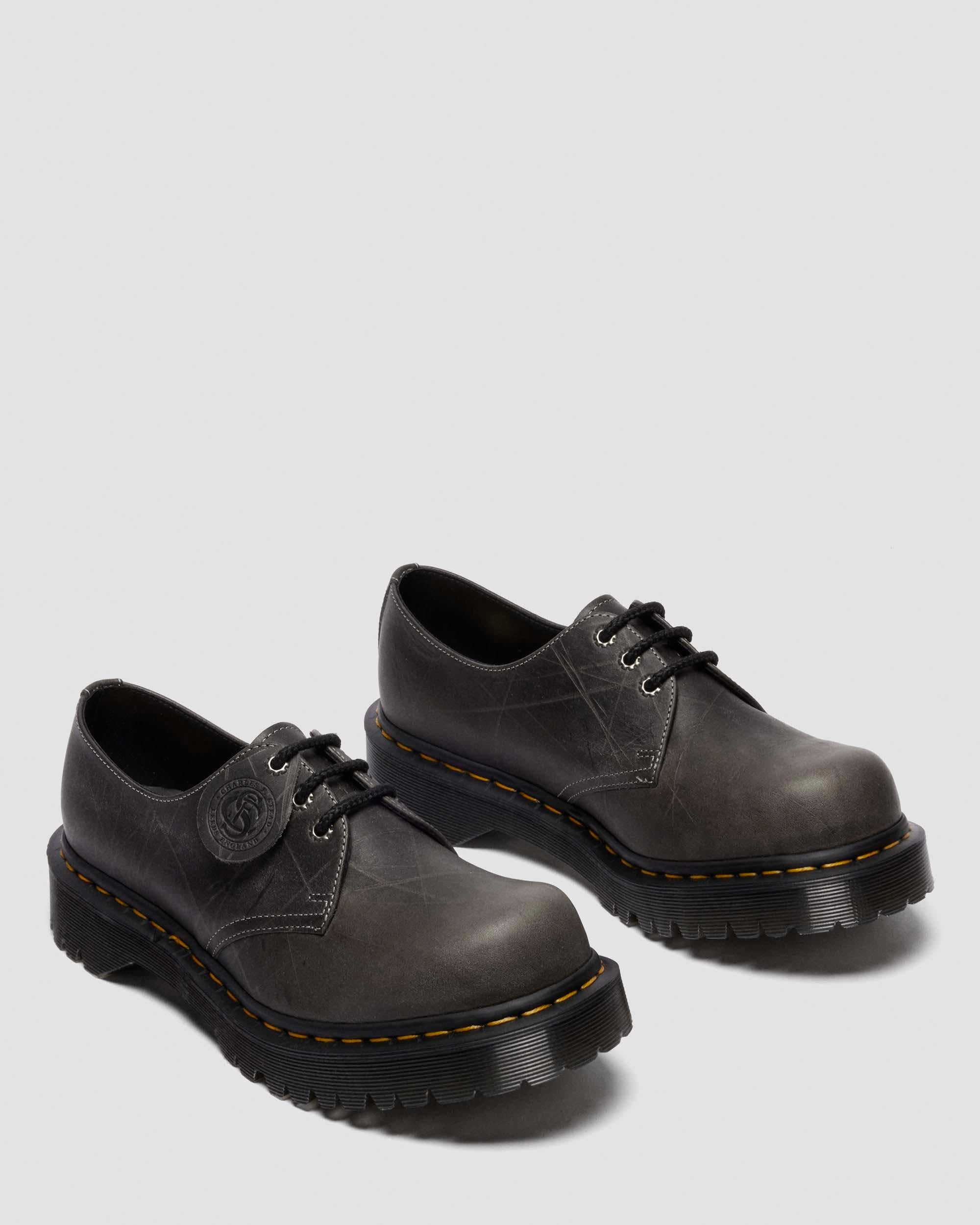 A bumped up build. The 1461 3-eye shoe is revisited through an industrial lens – with an exaggerated bump toe and a heavily textured leather update. Handcrafted in our original Northamptonshire factory, the upper utilizes Claw Grain leather, defined by its heavy wax finish and bold, distinctive texture. With tonal waxy braid laces and ‘reverse’ eyelets in antique silver, we kept traditional DM’s detailing in place with our yellow welt stitching. The silhouette is finished with a black Bex sole that delivers extra height so wearers can stand taller. Material Claw Grain is a rich and waxy leather with extreme markings and lines that resemble claw marks. Care Instructions Use Dr Martens Protector spray to protect the leather and maintian the colour contrasts between scratches & grain, If lesser of a contrast is required use Wonder Balsam Shoe Protector, follow product instructions. Construction Goodyear Welted - the upper and sole are heat-sealed and sewn together, providing more comfort and durability for years to come. Product code 41598020 Gifts For All