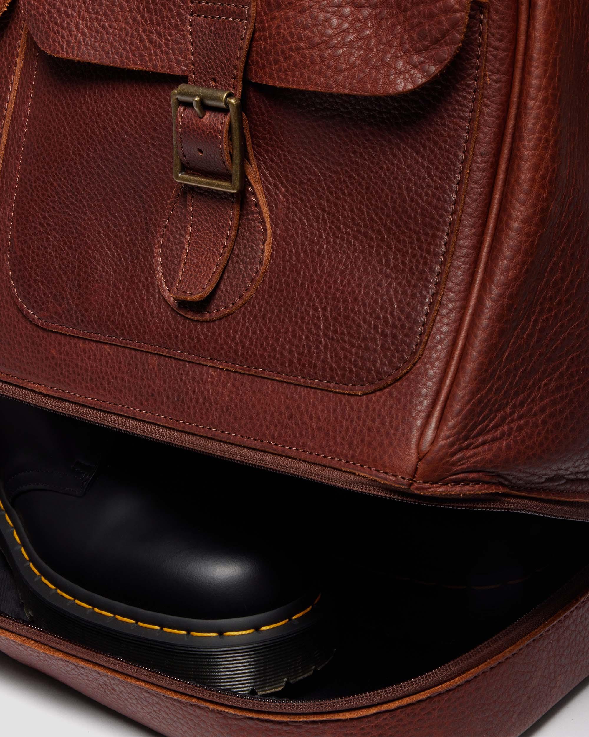 Shaped to take it all. The Weekender bag is our biggest silhouette – now in tumbled Ambassador leather that relaxes with wear. Alongside a large inner compartment, the bag features two front pockets and zippered bottom storage. Twin top handles make for easy picking up and putting down, or you can use the removable crossbody strap. Antique brass hardware features across the bag, including metallic feet for elevation when stationary. Material Ambassador - A heavyweight and oily leather that’s been tumbled for added character. Care Instructions Wipe away dirt using a damp cloth. Apply Dr. Martens Wonder Balsam to the outside of your footwear to keep the leather supple Product code 41697200 Gifts For All