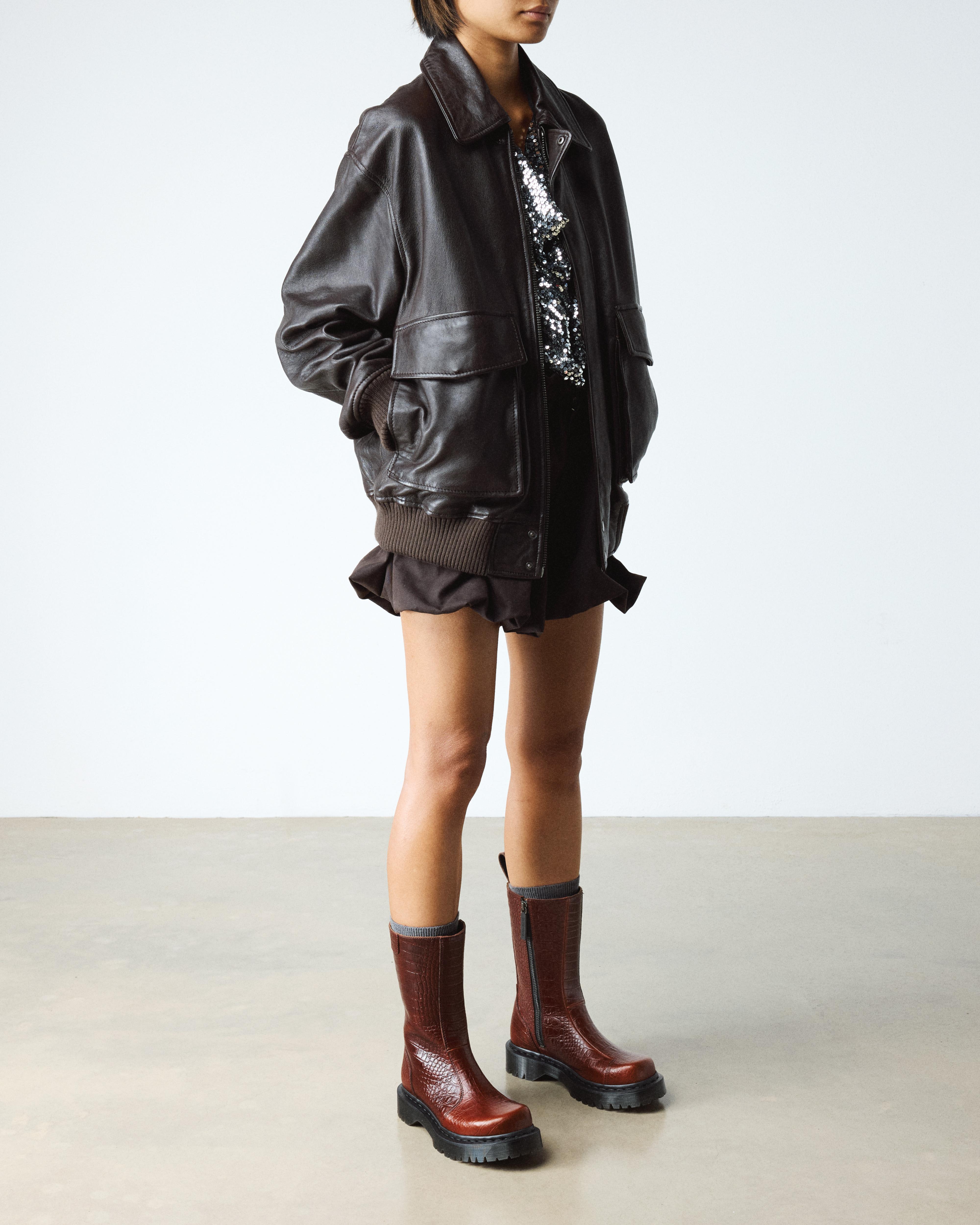 A new angle for DM’s boots. The Rejena subtly squares the bump toe design for a sleek new form. Expertly crafted from mocha brown Analine leather embossed with a crocodile skin design. The tall ankle boot is fitted with a full-length zip for ease of wear. Set on an extra height Bex sole in smoke with a black welt stitch. Finished with a leather AirWair heel loop. Material Croc Embossed Analine leather with strong wax coat and subtle pull up effect Care Instructions Clean away dirt using a damp cloth and allow to dry, then apply Dr.Martens Wonder Balsam, add to shoes using the sponge applicator supplied with the product. Construction Goodyear Welted - the upper and sole are heat-sealed and sewn together, providing more comfort and durability for years to come. Product code 41723200 Gifts For All