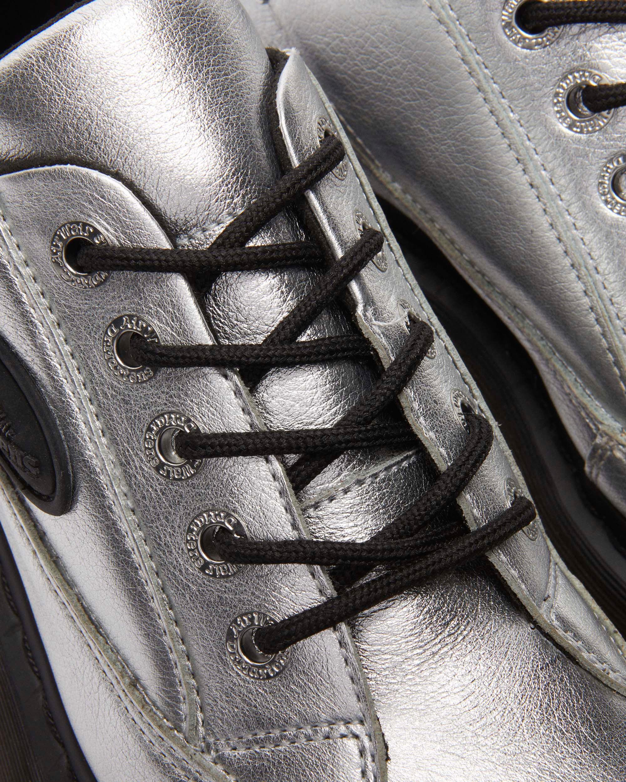 Feel the Buzz. Inspired by our 90s silhouettes, the new Buzz 5-eye shoe grabs attention from top to bottom. It stands on our chunky barrel-edge Buzz sole — marked with DM’s grooving, black welt stitching, and a leaf pattern on the undersole. The statement silver upper is made with soft, Metallic Tumbled leather and has a comfortable padded collar. An inflated, rubberized badge echoes the contours of the sole. Material Metallic Tumble - a naturally tumbled soft Nappa leather with metallic coating. Care Instructions Wipe away dirt using a damp cloth. We do not recommend the use of leather cleaners or aggressive cleaning, as it could damage the finish. Construction Goodyear Welted - the upper and sole are heat-sealed and sewn together, providing more comfort and durability for years to come. Product code 41795020 Women's Platform Shoes