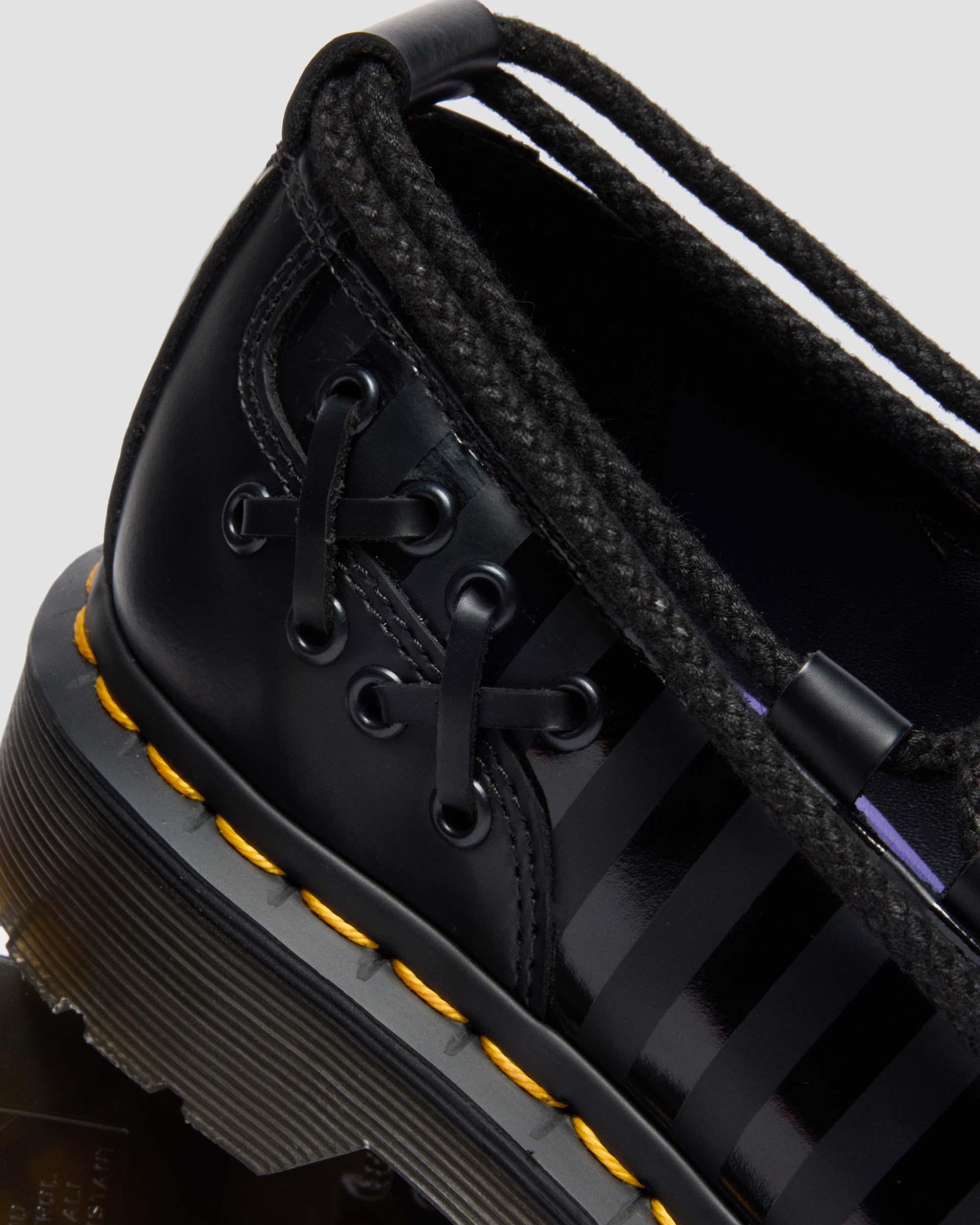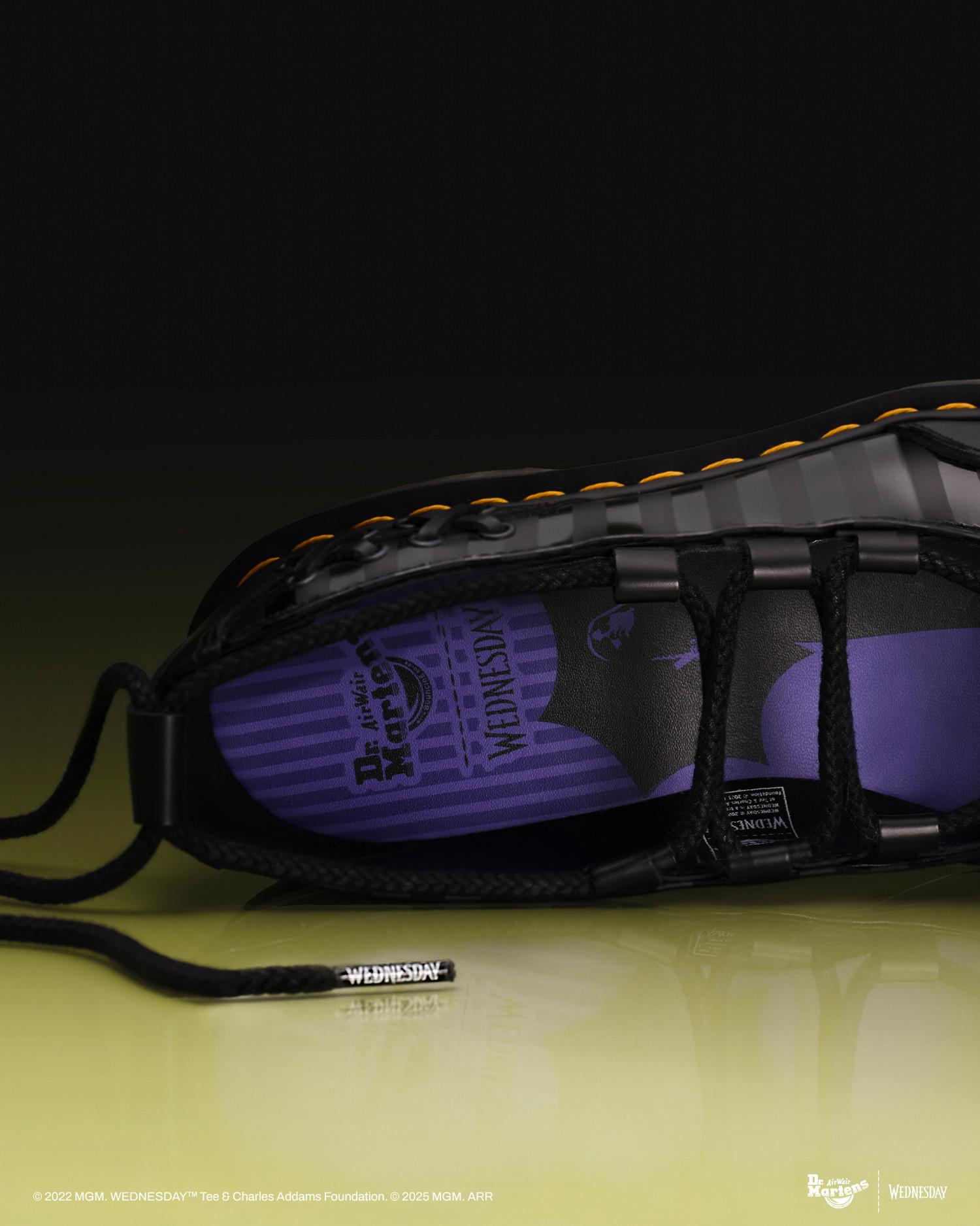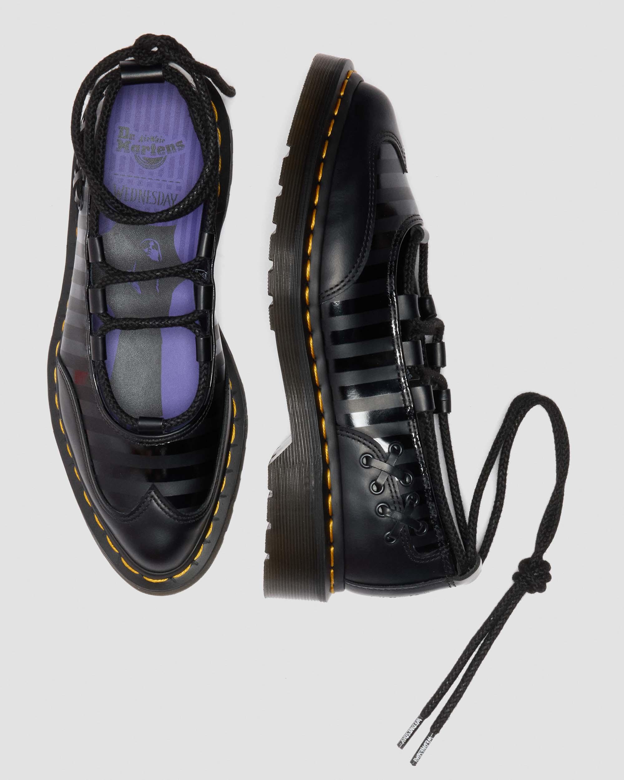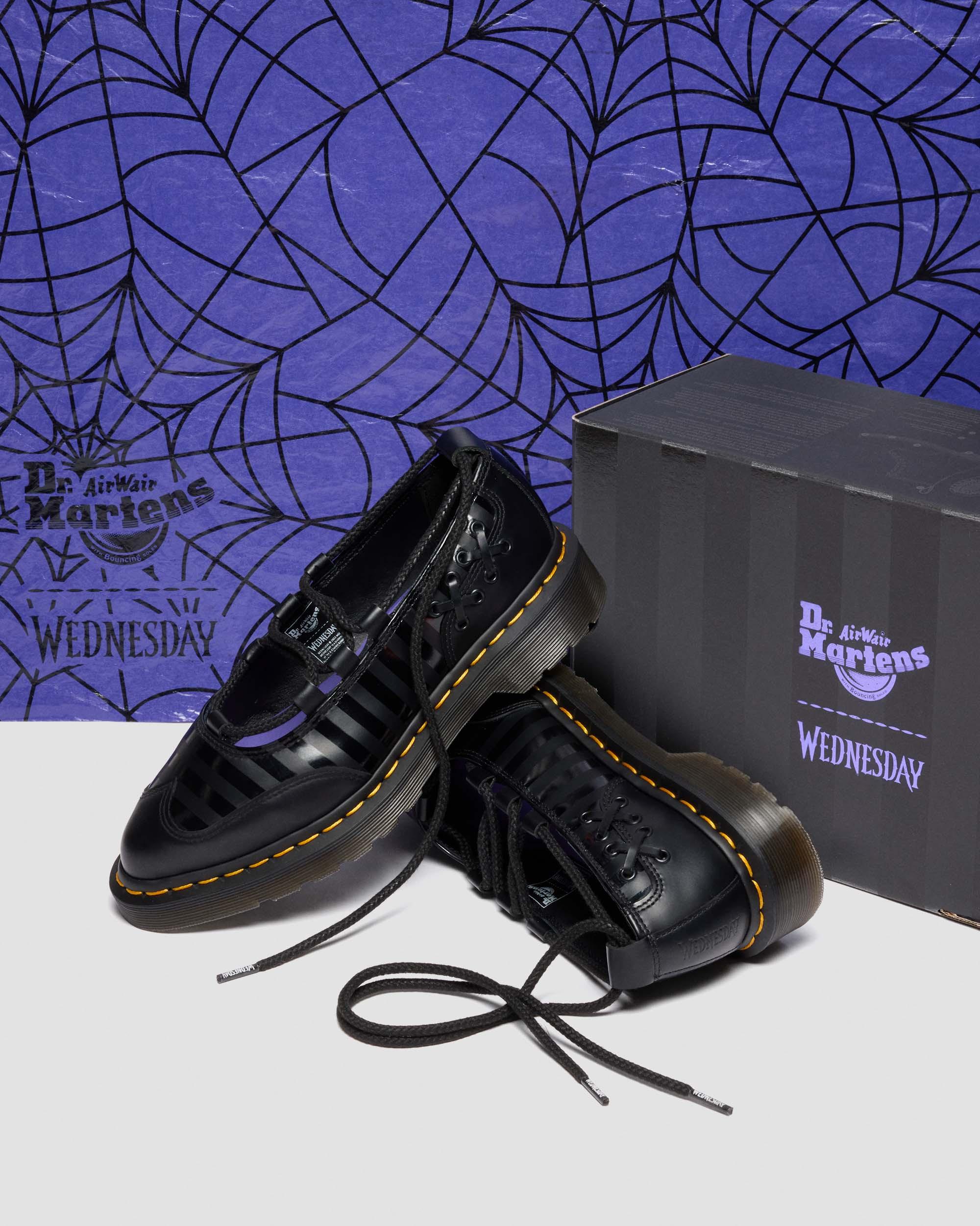 The Elphie Wednesday ballet flat reworks a classic shape through the lens of gothic subversion. Built from smooth black leather with tonal stripe detailing, the silhouette features a sharp wingtip toe minus the broguing - stripped back for a cleaner, more sinister feel. Delicate lace and eyelet embellishments frame the heel, while signature wrap-around laces tie at the ankle. Finished with custom aglets stamped with the Wednesday logo, a debossed heel mark, and our iconic yellow welt stitching on a stacked sole made for striding ahead of the crowd. Material Smooth - durable and famously stiff to start, this leather can be polished to a dapper shine or artfully scuffed-up depending on your preference. For tips on how to break in your Docs visit our Guide . Care Instructions Wipe away dirt using a damp cloth. Apply a neutral or correct colored wax based shoe polish. Buff with a Dr. Martens Shoe Brush to restore shine as desired. Construction Goodyear Welted - the upper and sole are heat-sealed and sewn together, providing more comfort and durability for years to come. Product code 41856001 Halloween Boots & Shoes