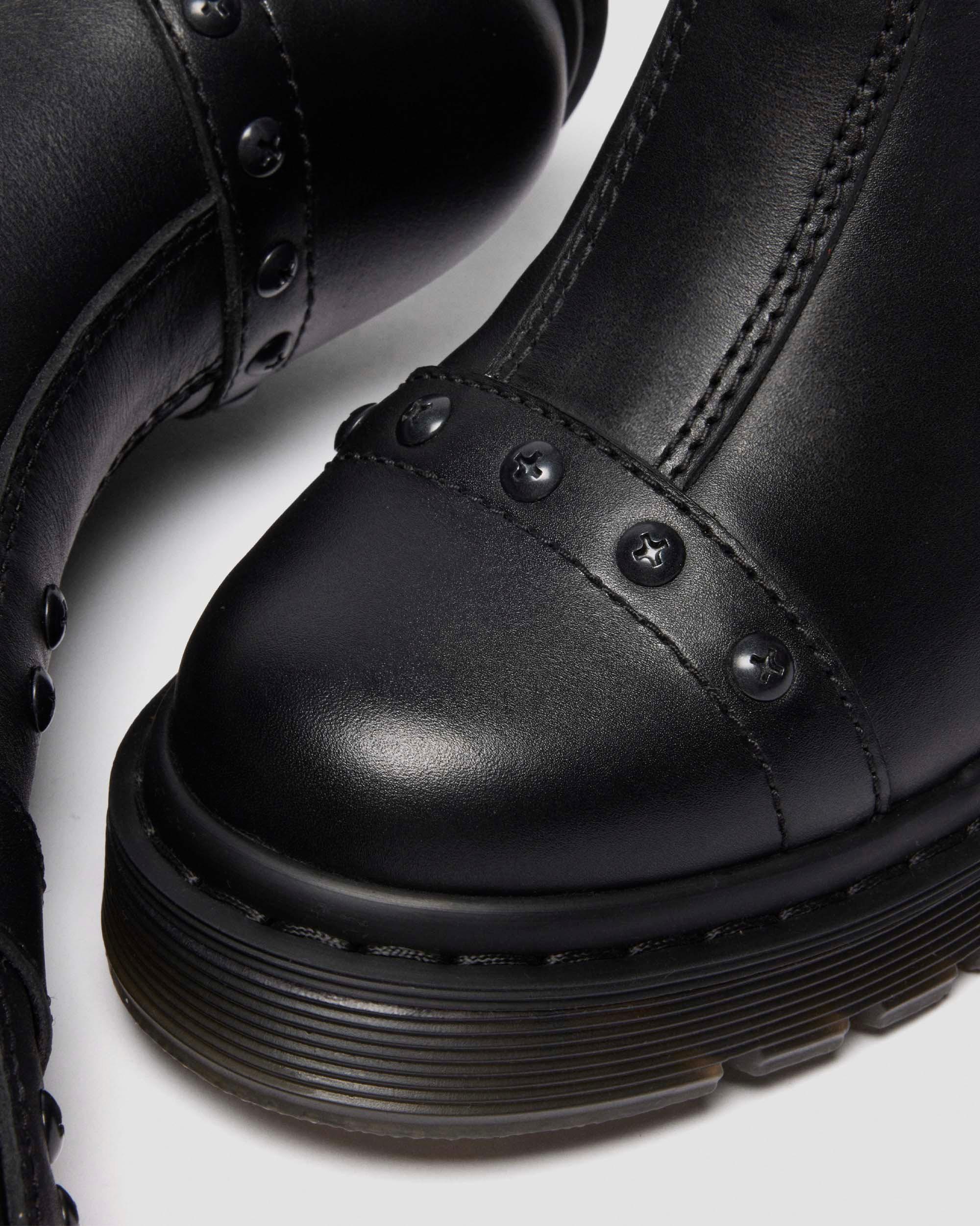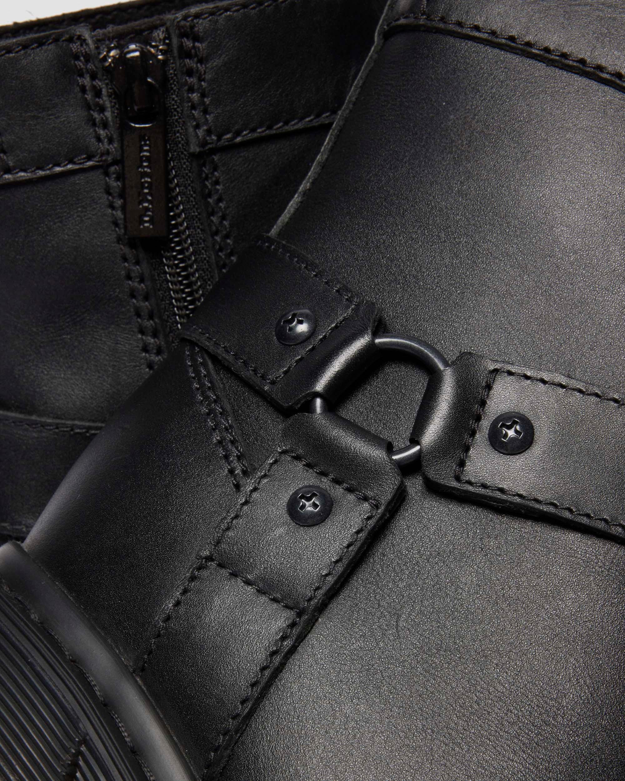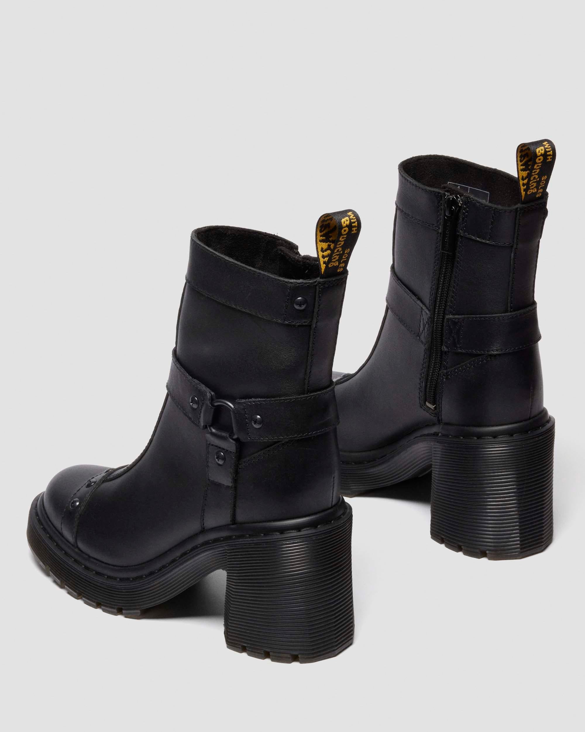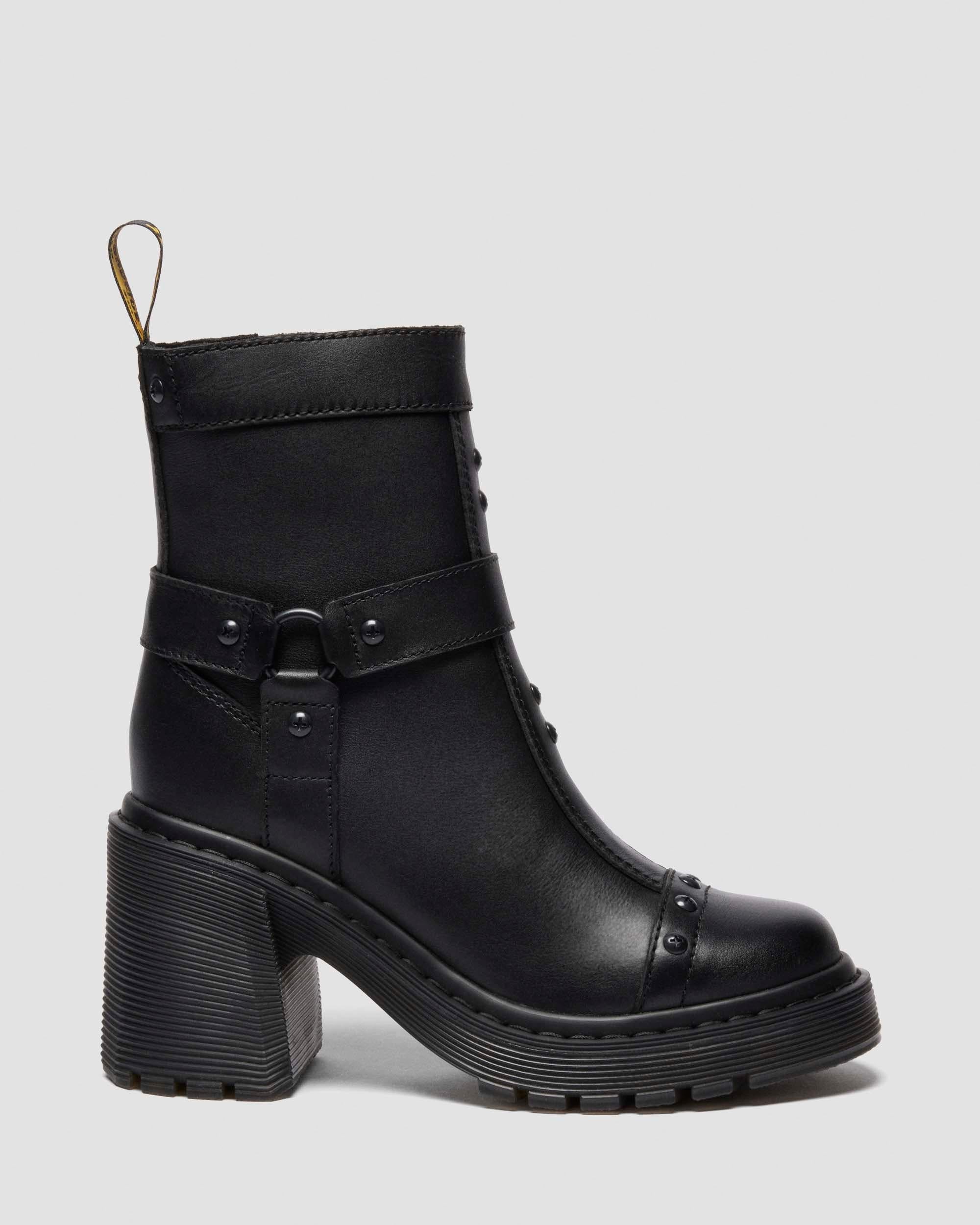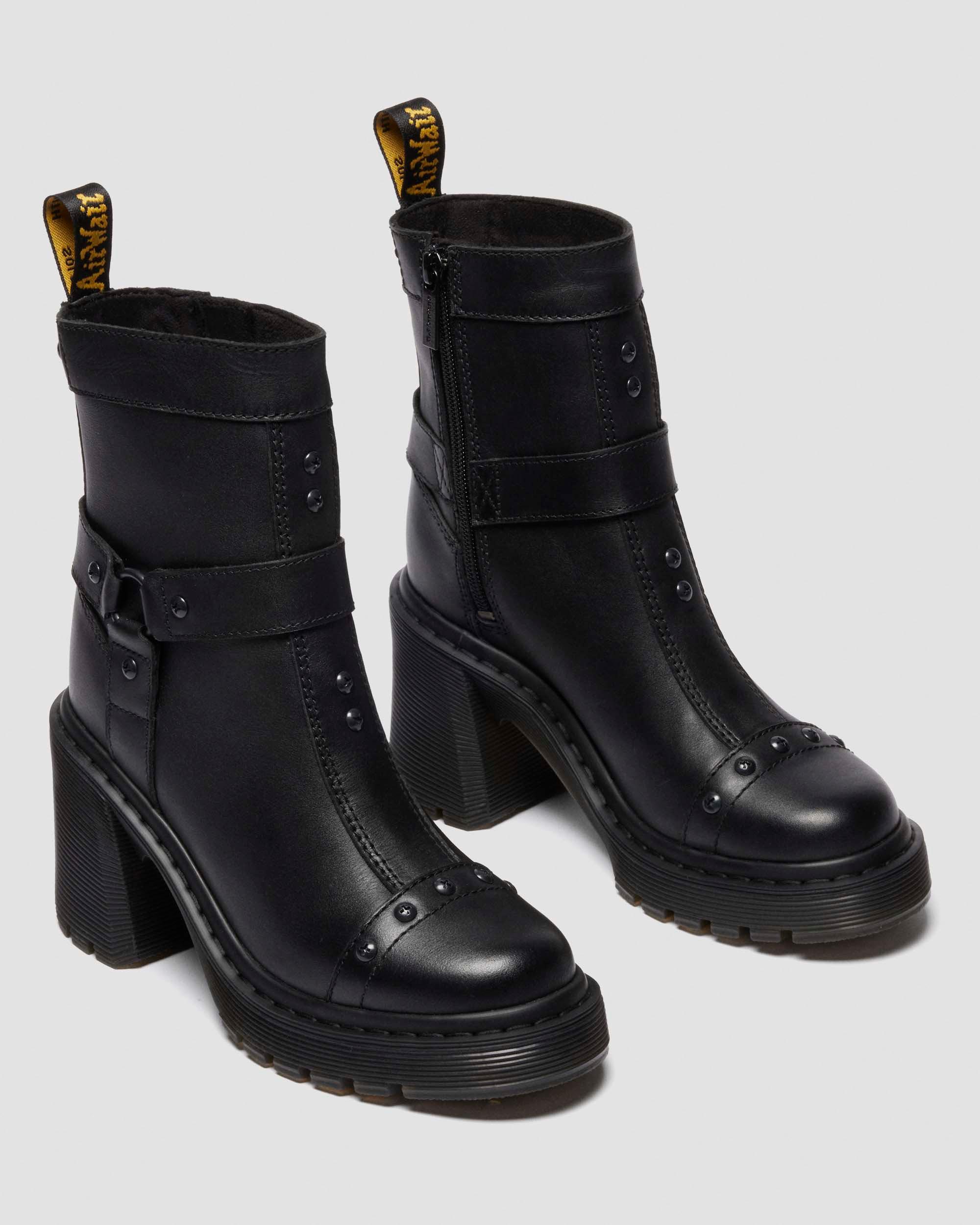 Heeled, harnessed and headstrong. The Spence Harness boot embodies our relentless attention to detail and craft. Built with Sendal, a smooth yet rugged leather, we upgraded the boot with a wraparound harness for extra edge and an additional leather placement on the toe that exaggerates the silhouette’s shape. Monochrome stitching runs across the upper and welt, and signature DM’s detailing includes our scripted heel loop and branded zip. The boot is stacked tall on a black grooved sole and towering flared heel for maximum impact. Material Sendal is a high quality, naturally soft leather that’s smooth and hardwearing. Care Instructions Wipe away dirt using a damp cloth. Apply a neutral or correct colored wax based shoe polish. Buff with a Dr. Martens Shoe Brush to restore shine as desired. Construction Cemented - the sole is cemented to the upper, a durable and flexible construction for all day comfort. Product code 42614001 Trending Styles