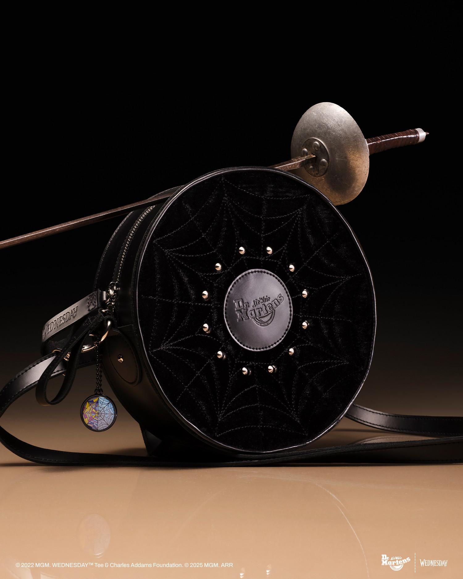 Dark romanticism distilled into a circular backpack. Built from black velvet and grounded with a hard-wearing black Kiev leather base. A spiderweb motif radiates across the front panel in intricate embroidery, punctuated with silver cone studs and debossed DM’s x Wednesday branding. Velvet zip pulls and silver-tone hardware elevate the gothic detailing, while a removable stained-glass window charm channels the eerie elegance of Nevermore Academy. Finished with a hidden back panel pocket and adjustable straps for styling your own way. Material Kiev leather is a modified version of our classic Smooth leather, with a PU coating, polished surface and slight sheen. Velvet is a brushed fabric with a slight pile that features a soft, silky tough and attractive sheen. Care Instructions Wipe clean with a damp cloth only, do not use leather cleaner this may damage the finish. Product code 43063001 Halloween Boots & Shoes