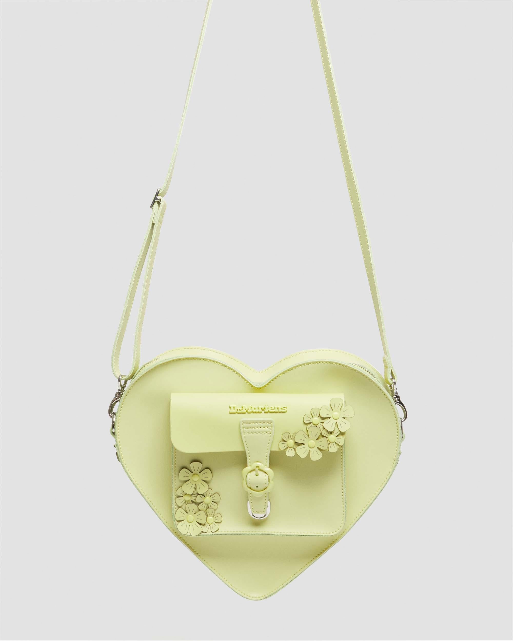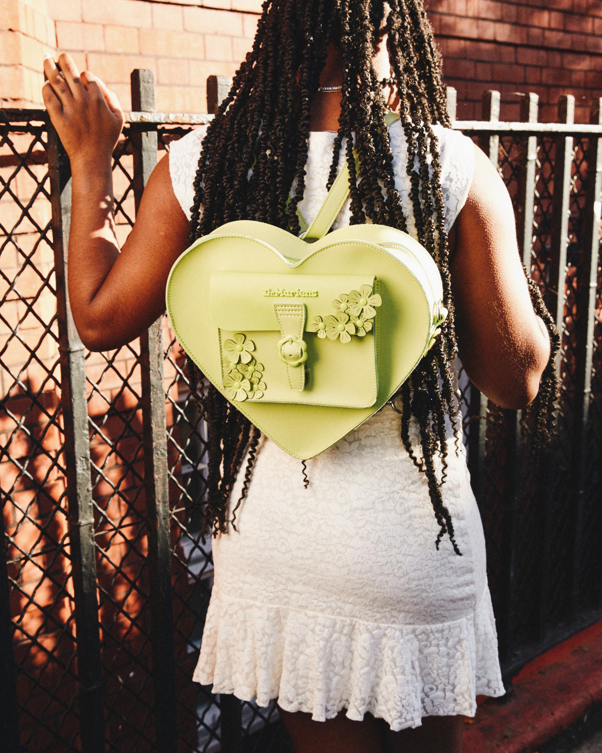 A vibrant Heart bag. Toughened up to DM's levels. Our crowd-favourite silhouette returns in rugged Kiev leather — fitted with a front zip pocket to keep essentials secure. One adjustable strap allows you to wear as a bag or backpack. Kiev is a hardwearing, rigid leather with a smooth surface and slight sheen Pocket and strap on black and white colors constructed from Patent leather Dimensions - 11 1/2 in. tall, 10 in. wide, 3 in. deep Material Kiev - A PU coated version of our classic Smooth leather. Care Instructions Wipe away dirt using a damp cloth. We do not recommend the use of leather cleaners, as it could damage the finish. Product code AD015316 Women's Bags